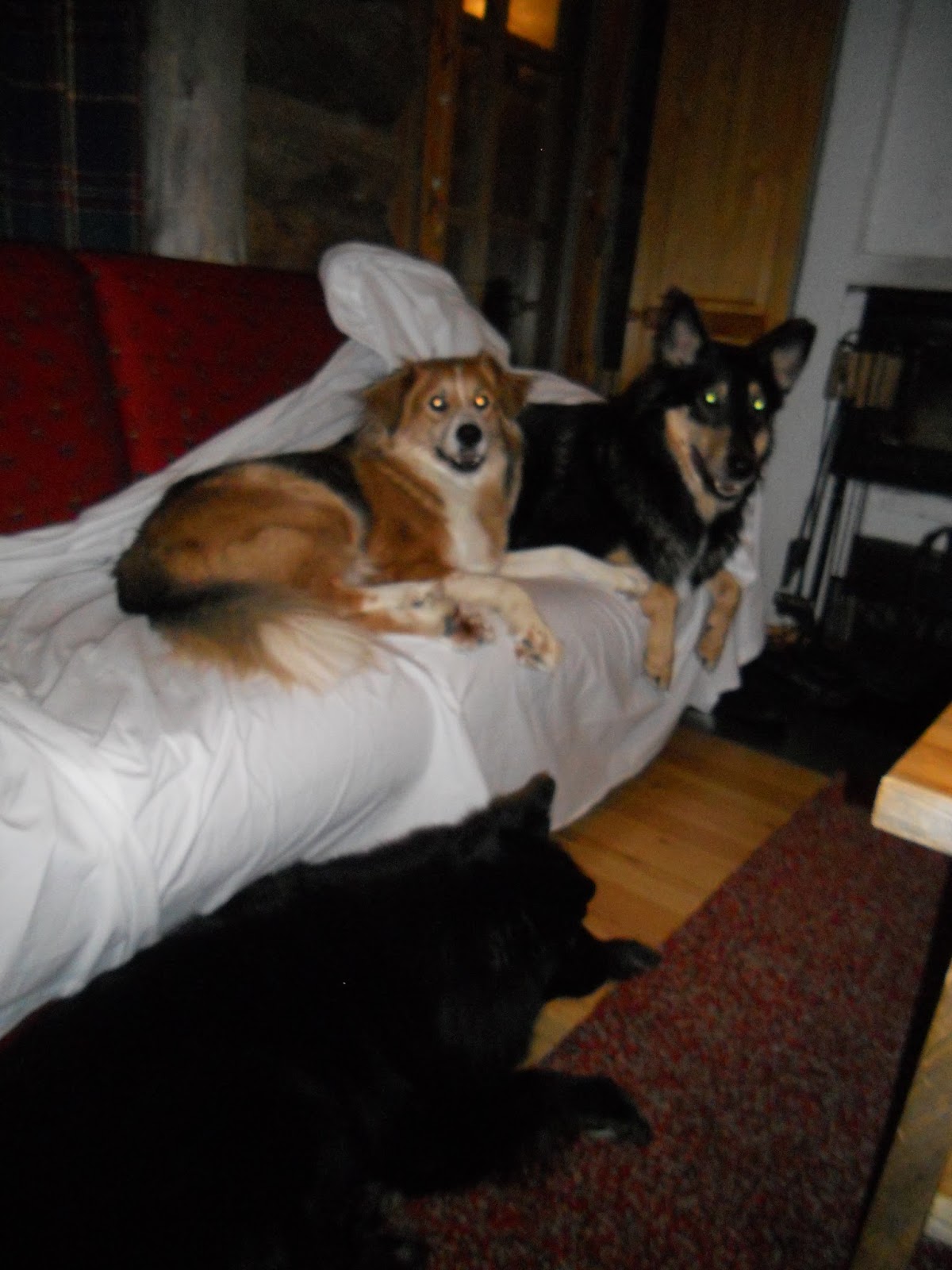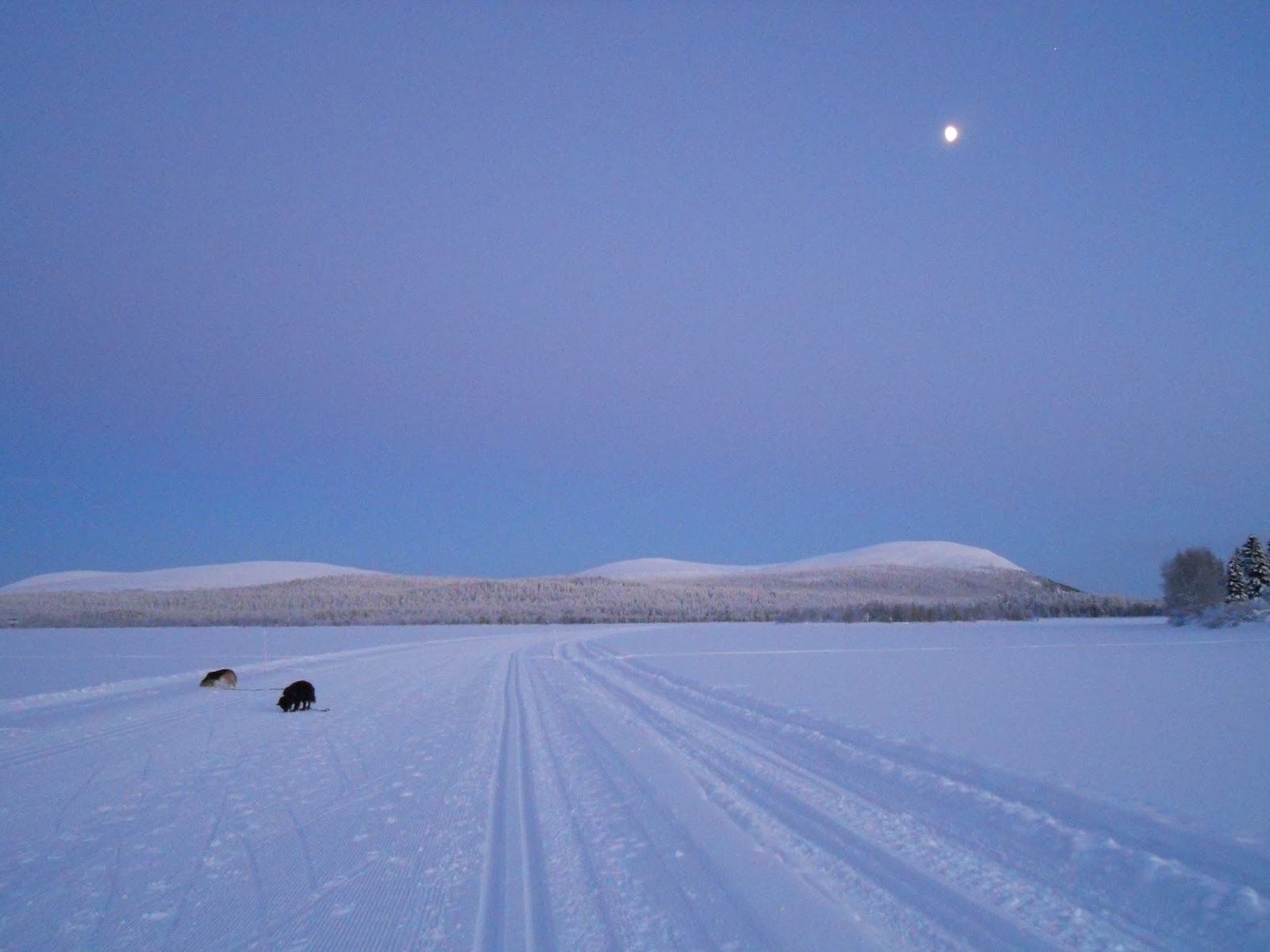 Mökille päästyäni vaihdoin laskettelusukset tavallisiin suksiin ja lähdin ystäväni kanssa jäälle hiihtämään, koirat seurana. Se sujui hiukan paremmin, tai oikeastaan en hiihtänyt, vaan koirilla oli vetovaljaat ja vetivät minua jäällä. Se oli ihan hurjan hauskaa, mentiin lujaa. Tätä harrastettiin monena päivänä järven jäällä. Kerran yksi koirista näki jään toisella puolella poroja ja silloin koira, minä ja sukset menimme lujaa, en tiedä mitä olisi tapahtunut ellen olisi päästänyt irti kun vauhti vain kiihtyi, kiihtyi ja kiihtyi (koira ei päässyt poroille asti), seuraavalla kerralla pitää harjoitella jarrutusta.