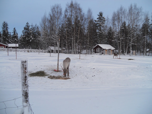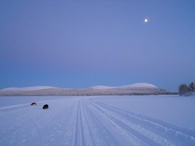 Toisena iltana menimme suksilla käymään Jounin kaupalla, koiratkin oli mukana ja paluumatkalla tuli taas poroja vastaan. Itse tykkään hirveästi poroista, sen vuoksi on kotona Pentikin Saaga-poro sarjaa, jotta porot hyppisivät joka päivä silmille kotonakin.
