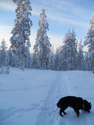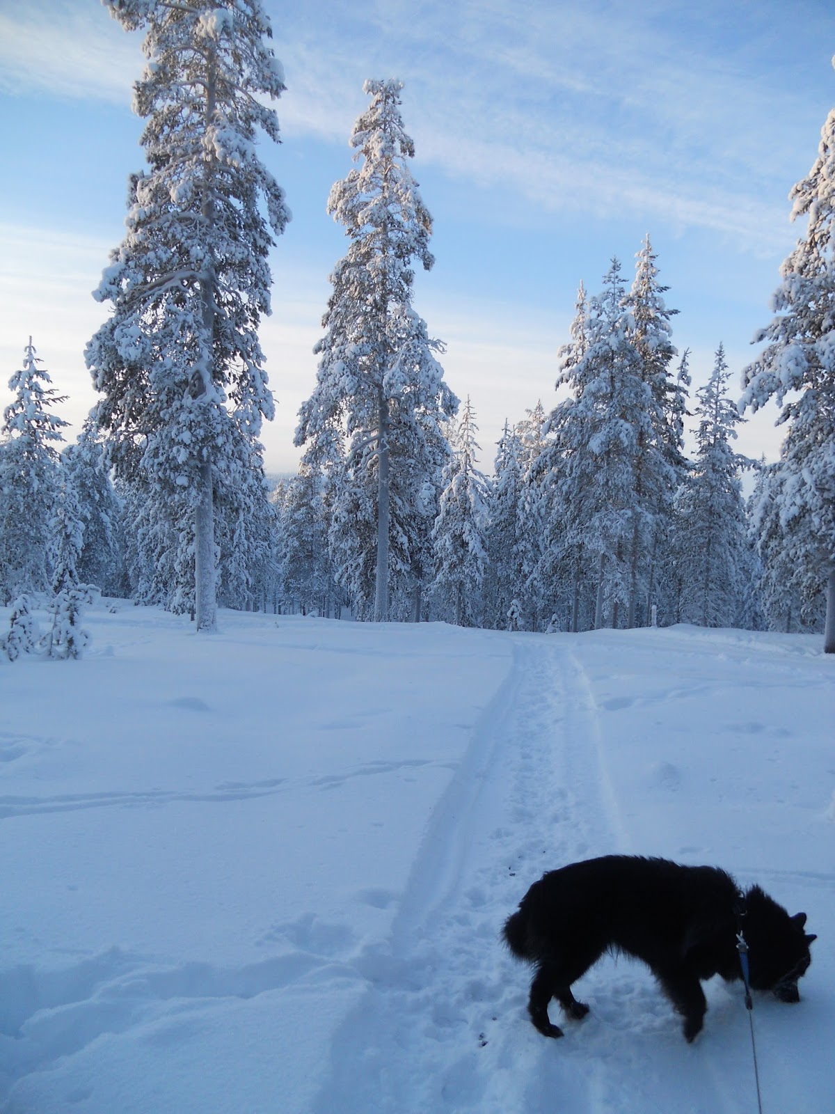 Eräänä kylmänä -29 päivänä lähdin Suomenlapinkoiran kanssa moottorikelkkareittiä pitkin katsomaan poroja. Ystäväni oli omilla seikkailuillaan löytänyt hyvän poropaikan, jossa oli monia kymmeniä poroja. Kävelimme koiran kanssa n. 3 km verran loivaa nousua rauhalliselle paikalle. Siellä tosiaan odotti suuri määrä poroja. Koira jännitti takanani, haukahti, murisi ja hetken aikaa haisteli. Olipa jännittävää molemmille, siinä niitä ihmeteltiin.