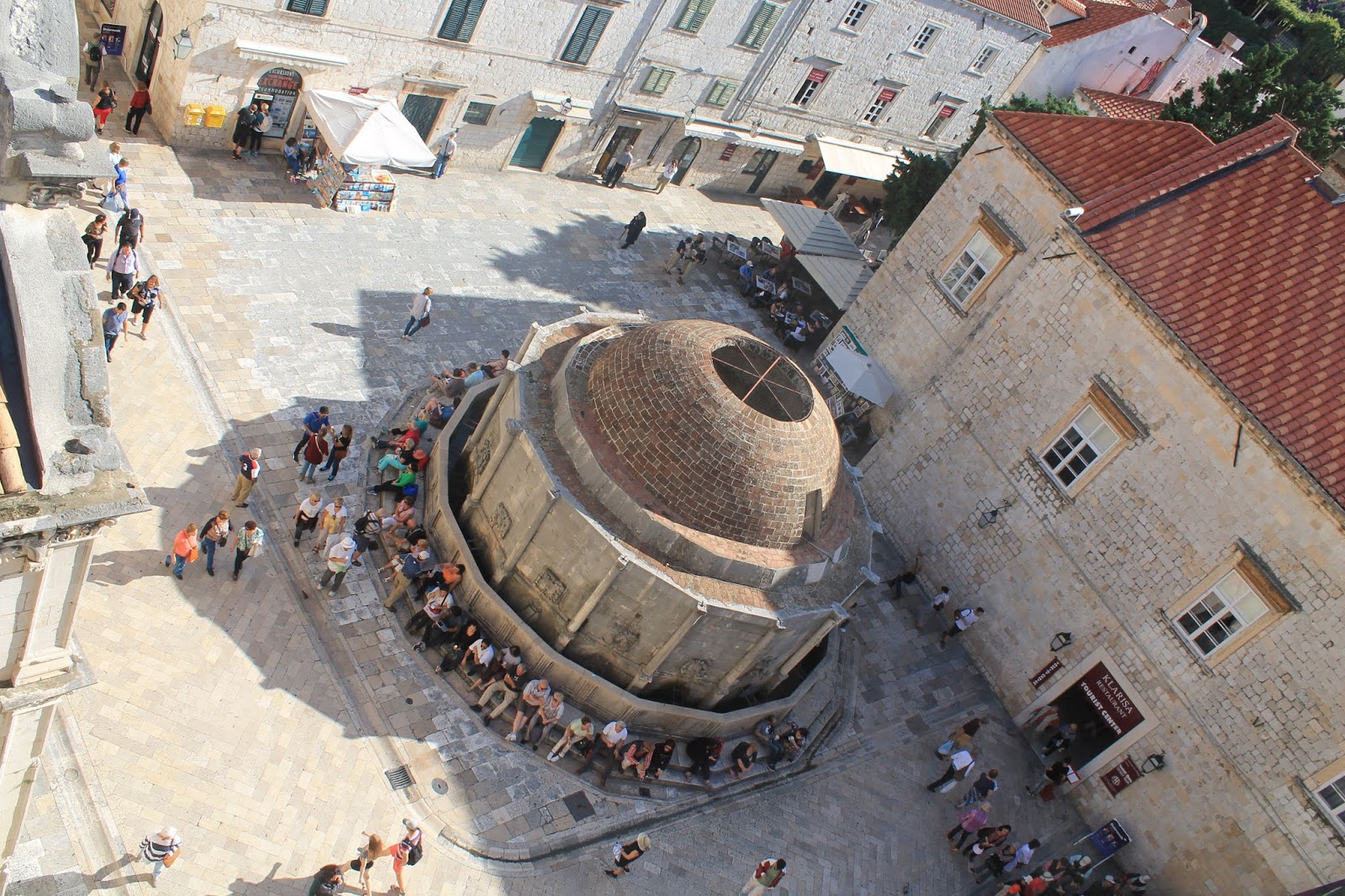 Dubrovnikin vanhakaupunki on rakennettu 1300-luvulla ja sen 292 metriä pitkä pääkatu on tehty marmorista ja siksi se kiiltää. Kaupunginportteja on kolme, Pile, Ploca ja Burza ja kaupunkia ympäröi korkeat muurit. Meillä meni reilu pari tuntia, kun kiersimme kaupungin 2 km pitkät muurit, jonne oli 100 kunan sisäänpääsymaksu. Pysähdyimme usein ihastelemaan (kuvaamaan) hienoja maisemia, matkan varrella oli pieniä tykin luukkuja joista sai kurkistella merta, linnoituksia ja saaria. Muurien päällä oli kolmisen taukopaikkaa, tauko teki hyvää sillä rappusten kiipeäminen tuntui jaloissa.