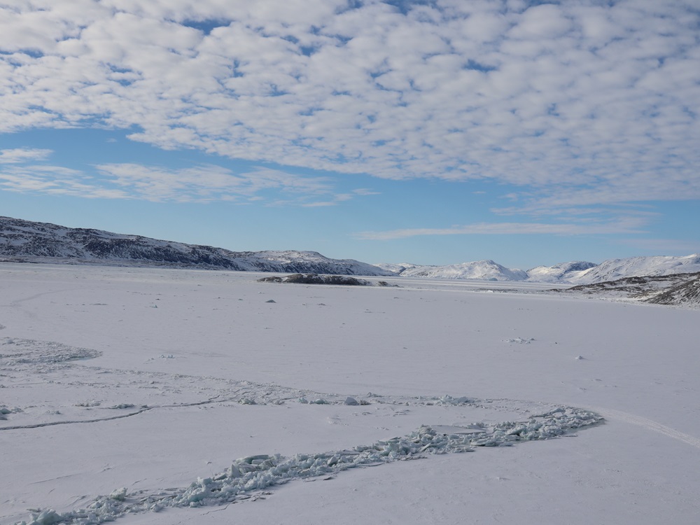 Eteen osui niin kauniita maisemia, aamuaurinko nousi vuoren takaa kauniisti ja lumi oli osittain jo sulanut vuoren rinteiltä. Olimme erämaassa, Grönlantilaisessa erämaassa. Ensin harmittelin, kun en saanut kelkankyydistä ikuistettua tätä kameraan mutta huomasin rauhoittuvani ihan eri taajuudella, kun elin läsnä enkä kameran kautta.