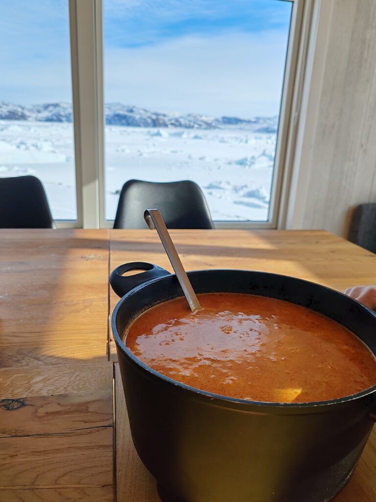 Pidimme Lodgella pidemmän tauon ja söimme Kaalin appiukon valmistamaa kalakeittoa, todella herkullista ja onneksi en tiedä mitä kaikkea se sisälsi. Jäätikön sulanut vesi maistui todella hyvältä ja raikkaalta. Kaali näytti vielä mökin seinältä karttaa, mistä näkee missä jäätikönraja on aiemmin mennyt, kartasta ei edes enää näy missä se on tänä päivänä.
