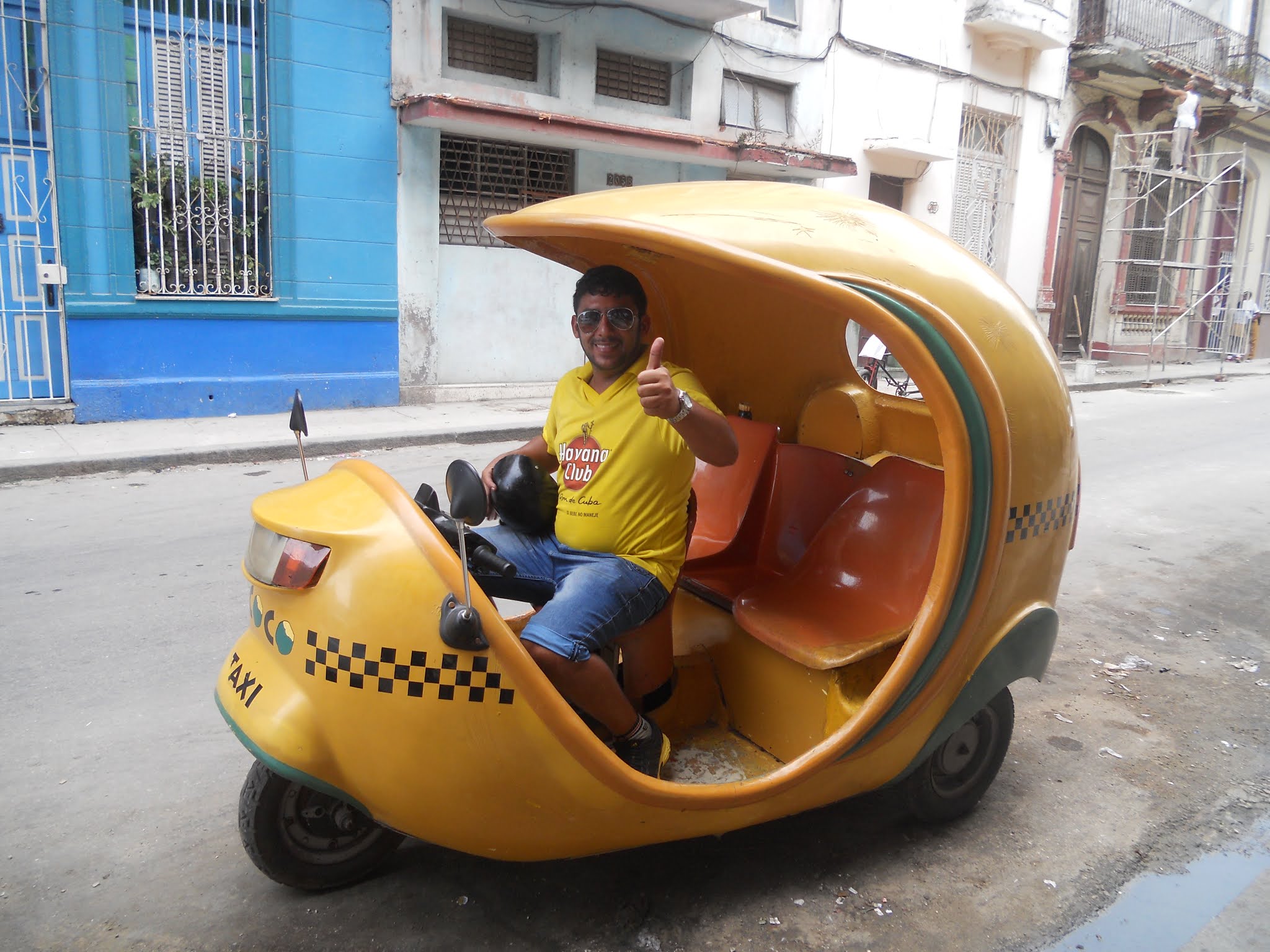 Hautausmaalta jatkoimme keltaisella coco mopotaksilla majapaikkaamme. Ohitimme Jose Martinin vallankumouksen aukion, jossa on näyttävä Che Guevara kuva talon seinällä. Cocotaksimme bensa loppui matkan varrella, joten haimme kanisterista lisää bensaa. Kuljettaja oli mukava ja kertoi kuinka erottaa valtion ja yksityisen auton, niissä on erilainen rekkari. Yksityinen on valkopohjainen ja valtion sini/violetti.