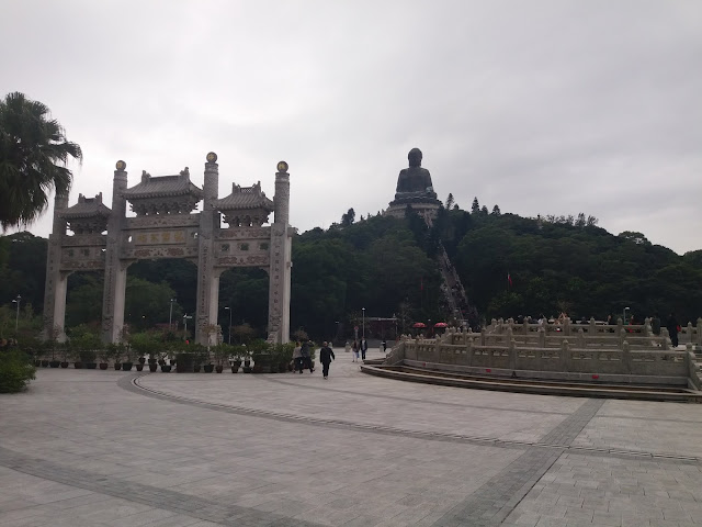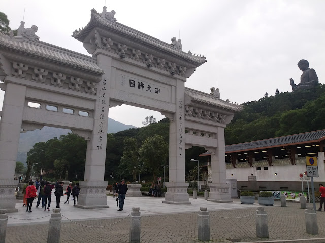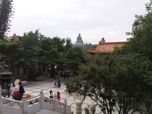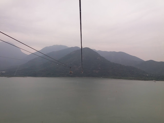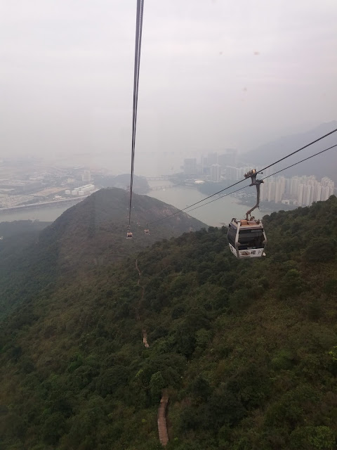 Hongkongin lentokenttä sijaitsee Lantaun saarella ja samalla saarella sijaitsee myös suuri Buddha patsas. Olimme Hongkongissa aikaisin aamulla, joten suuntasimme suoraan lentokentältä bussilla Tung Chung metroasemalle, jonka yhteydessä olevassa ostoskeskuksessa on paljon outlet myymälöitä. Samasta paikasta lähtee Ngong Ping 360 kaapelihissi suurelle Buddha patsaalle. Kaapelihissille oli jo aamusta pitkä jono ja noin 45 min päästä istuimme yläilmoissa hienojen, vehreiden maisemien yllä, alapuolella näkyi patikkapolkuja ja vettä. Kaapelihissimatka on noin 5,7 km pitkä ja kestää puoli tuntia, siinä ehtii hyvin ihailla ympärillä olevia maisemia. Kannattaa vähintään toiseen suuntaan mennä kyseisellä kaapelihissillä.