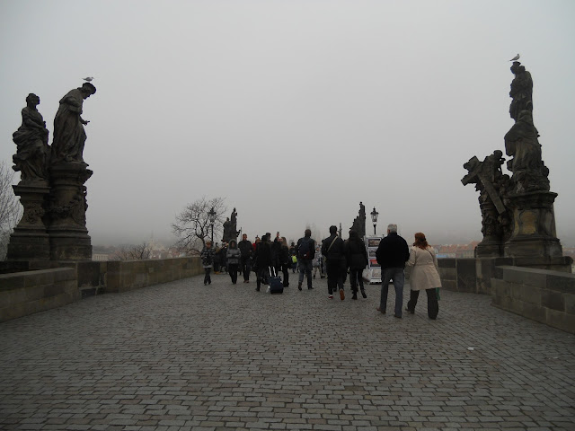 Kaarlensiltakin oli paikoitellen ihan tukossa. Toki Kaarlensilta on niin tunnettu nähtävyys, etten yhtään ihmettele. Kun Kaarlensiltaa ylittää, siinä väkisinkin miettii, miltä silta näyttäisi ja miltä se tuntuisi ylittää ilman muita ihmisiä. Kaarlensillalla myytiin paljon tauluja ja sen varrella oli jonkin verran epämääräisiä kerjäläisiä koirineen. Itse silta on hyvin kaunis lukuisine patsaineen!