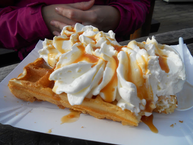 Ylhäällä oli kahvila, josta tilasin itselleni kinuskivohvelin! Siellä oli myös jokin leikkipaikka ja rinnerata. Oltiin ylhäällä hetken aikaan, kunnes lähdimme kävellen alas. Rinne oli jyrkkä ja liukas ja meinasimme liukastua vaikka kuinka monta kertaa. Meillä oli alas tullessa tosi hauskaa. Alastulo kesti reilu puoli tuntia.