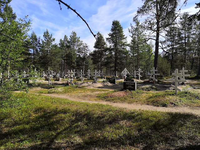 Perinnetilan vieressä sijaitsee kylän ortodoksinen kirkko sekä sen takana hautausmaa. Parkkipaikalta alkaa Sevettijärvi-Pulmankijärvi vaellusreitti, siitä yhteydestä kai Sevettijärvi nimenä on myös tuttu. Meidän oli tarkoitus käydä myös Sevettijärven harjupolulla, mutta se sitten unohtui kun olimme ajatuksissa jo matkalla kohti Näätämöä ja Norjaa. Sevettijärvi oli hieno, pieni erämainen ja aito saamelainen kylä. Näätämössä oli vielä Seon ja Nesteen huoltoasemat ja pikku kauppa, jonka pihassa jolkotteli poro.