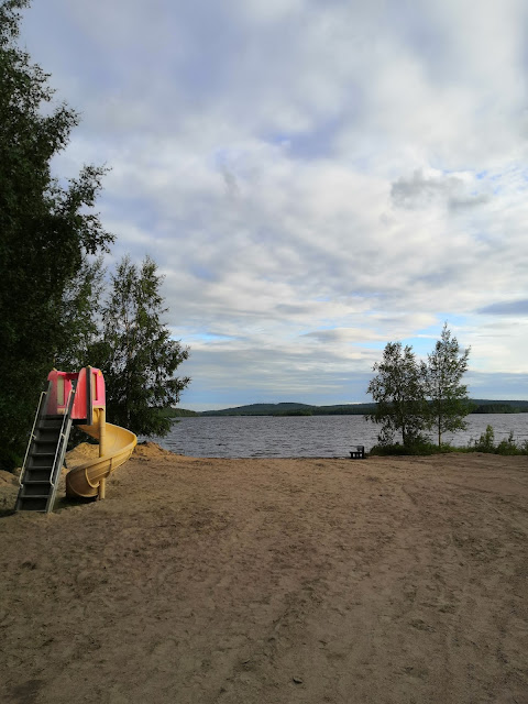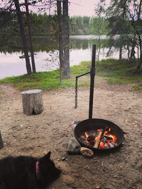 Telttapaikka oli erittäin edullinen, vain 5 euroa yö + 2 euroa / hlö. Hyttysiä oli aivan ennätysmäärä, onneksi oli thermacell ja hyttysmyrkky apuna. Lähdin tytön ja koirien kanssa kävelemään järven reunaa pitkin kohti rantasaunaa, jonka olisi saanut varata. Pystytimme leirin ja asettauduimme loppuillaksi rannalla sijaitsevalle laavulle, tuli piti hyvin hyttysiä poissa.