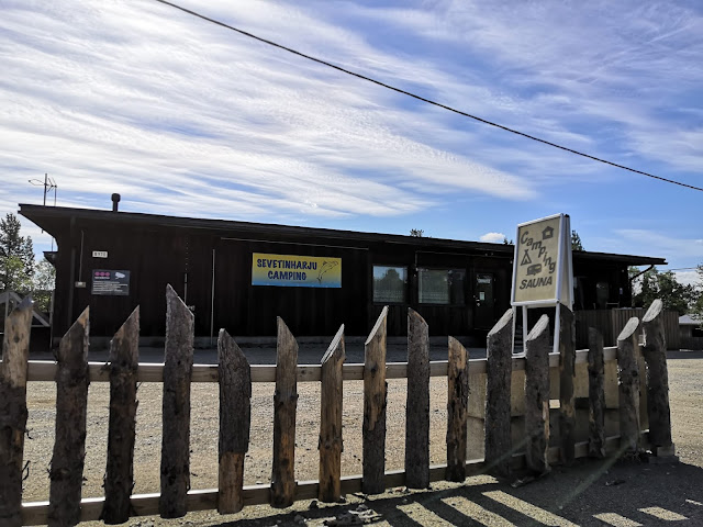 Navigoimme Peuralammen leirintäalueelle, joka olikin suljettu. Pyörimme hetken Sevettijärven keskustaa ihmetellen ja mietimme, missä sitten yöpyisimme. Muistin nähneeni toisen leirintäalue kyltin hieman ennen keskustaa, mutta mielestäni se näytti siltä kuin se ei olisi enää toiminnassa. Käännyimme kuitenkin katsomaan ja pihalle saavuttuamme, aukesikin vastaanoton ovi ja nainen oli meitä vastassa ja toivottamassa meidät tervetulleiksi. Vastaanotossa tuntui siltä kuin aika olisi pysähtynyt, kello tikitti hitaasti seinällä.