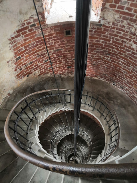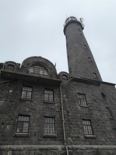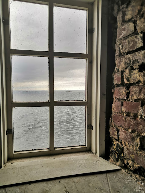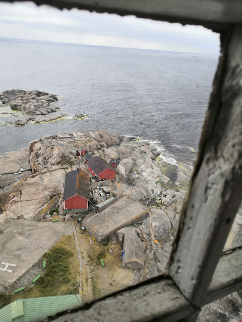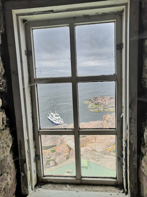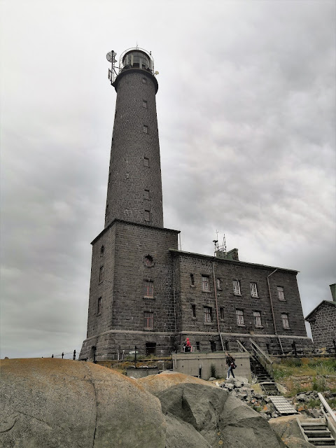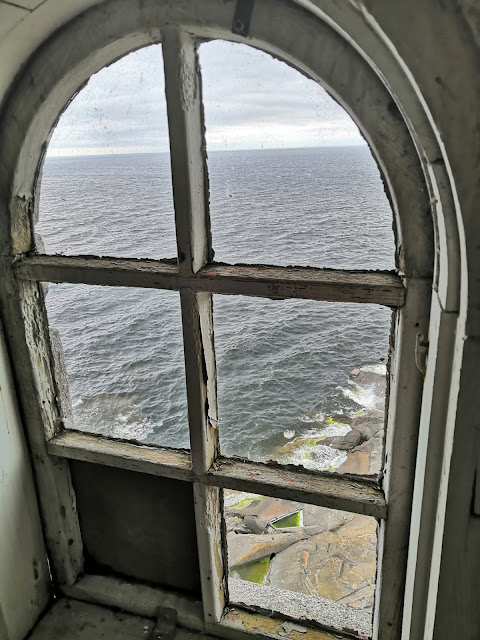 Pohjoismaiden korkein majakka on rakennettu vuonna 1906 ja se yltää 52 metrin korkeuteen meren pinnasta. Majakan torniin johtaa 252 rappusta ja huokaisen helpotuksesta kun en joudu kantamaan tyttöä kaikkia rappusia ylös, vaan hän kävelee itse vetäen äitiä perässä. Rappusten kiipeäminen sujuu yllättävän vaivattomasti kun välillä jäämme katsomaan maisemia ja toisinaan istumaan ikkunoiden syvennyksiin. Valohuoneessa emme käy, sillä en halua kiivetä sinne johtavia pystysuoria tikkaita lapsi sylissäni.