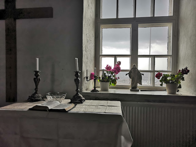 Toisessa kerroksessa on majakanvartijan huone, jonka vieressä sijaitsee pieni kappeli. Istumme kappelin penkillä lämmittelemässä, samalla katsoen kappelin ikkunasta merelle. Majakan työntekijä kävelee huoneen läpi tuoreet pullat tarjottimella ja tuoksu on niin luokseen kutsuva, että menemme siltä istumalta syömään uunituoreet pullat majakan konehuoneen kahvilaan. Vierailun jälkeen tyttö huutaa aina majakan nähdessään, katso kirkko! Mietin mistä moinen yhdistelmä, mutta oivalsin tytön sekoittavan Bengtskärin kappelista ja korkeasta tornista johtuen kirkon ja majakan.