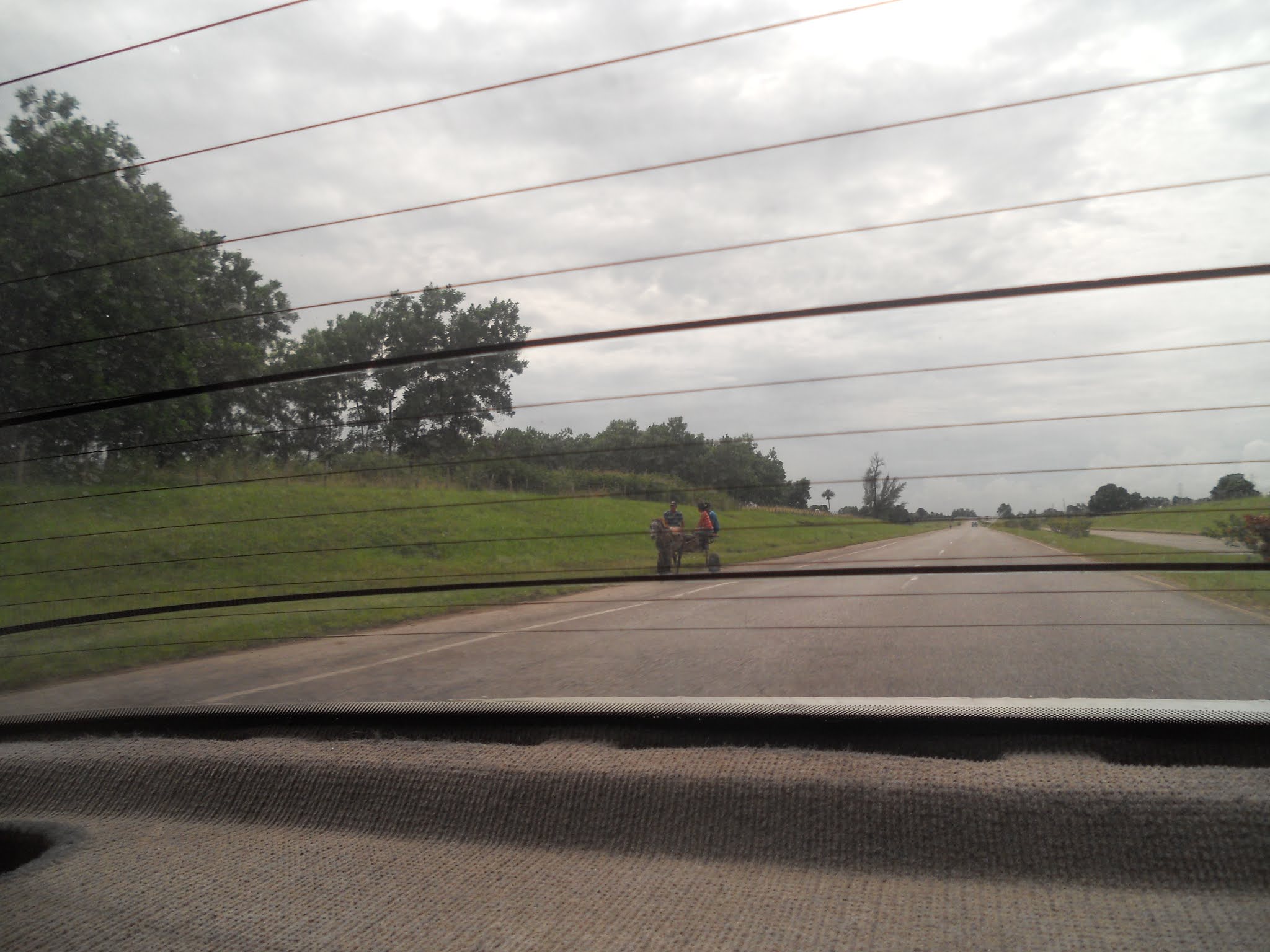 Moottoritie on suhteellisen hyvässä kunnossa, kuoppainen kylläkin. Auton ikkunasta näkyy paljon erilaisia puita, banaaniviljelmiä, sokeriruokopeltoja, palmuja, hevosia, lehmiä ja suuria petolintuja. Autoja tosiaan ei moottoritiellä juurikaan ole, hevoskärryjä kylläkin. Täällä maaseudulla liikkuvat ihmiset edelleen hevosilla, eikä autoilla. Lehmät, hevoset ja pukit liikkuu täällä vapaana ympäriinsä. Teiden varsilla näkyi useita olkitaloja.