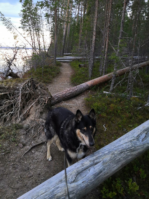 En voinut kuin ihastella näitä maisemia, jotka Oulujärvelle avautui heinäkuisena iltana. Olispa ihanaa, jos koirien kanssa saisi useammin kävellä tämänkaltaisilla poluilla ja maisemissa! Nautin tästä iltalenkistä tuhatkertaisesti enemmän kuin kotipuolessa. Tämä oli vasta alkua, sillä tästä alkaisi meidän pohjoisen roadtrip Lappiin ja Norjaan ja jo nyt sain nauttia hienoista maisemista. Täällä oli hienoa nimenomaan kangasmaasto ja pitkät hiekkarannat.