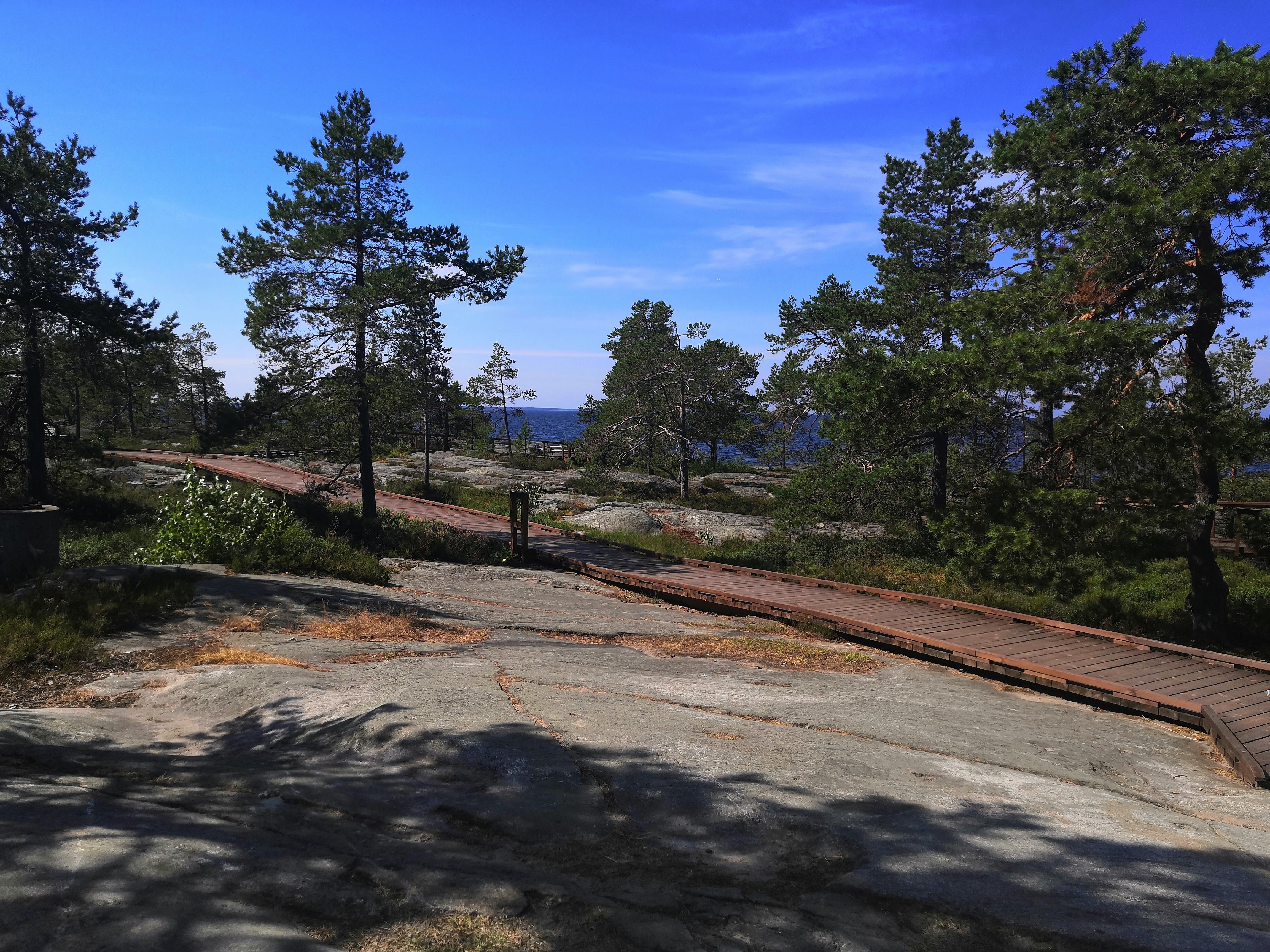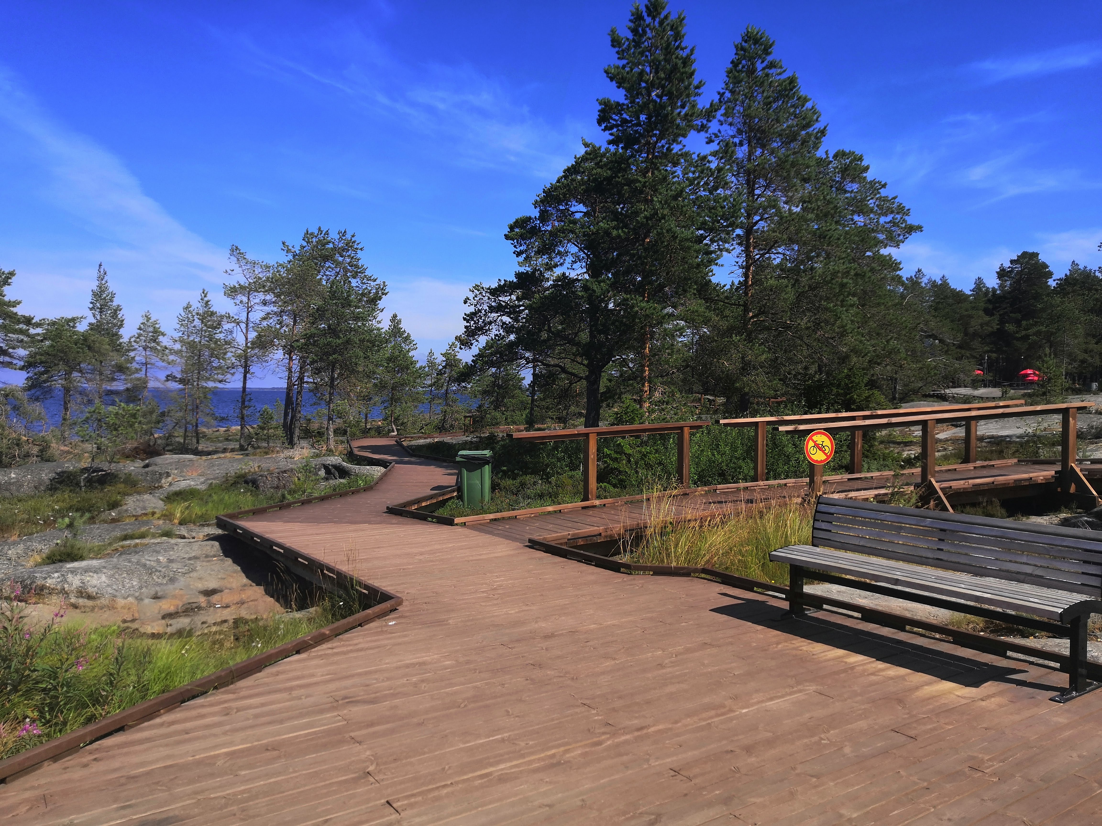 Kävelemme takaisin autolle ja ajamme n. vartin ajomatkan päässä olevalle Fäbodan ranta-alueelle. Täällä on ruuhkaa ja parkkipaikat ovat heinäkuisena kesäpäivänä lähes täynnä. Auton jätämme kahvilan lähettyville, jonka edustalla on vessat ja esteetön luontopolku. Luontopolku lähtee kahvilalta eikä ole pitkä, vain 170 metriä, mutta tälläkin kertaa tarpeellinen, sillä olen matkassa lastenrattailla.