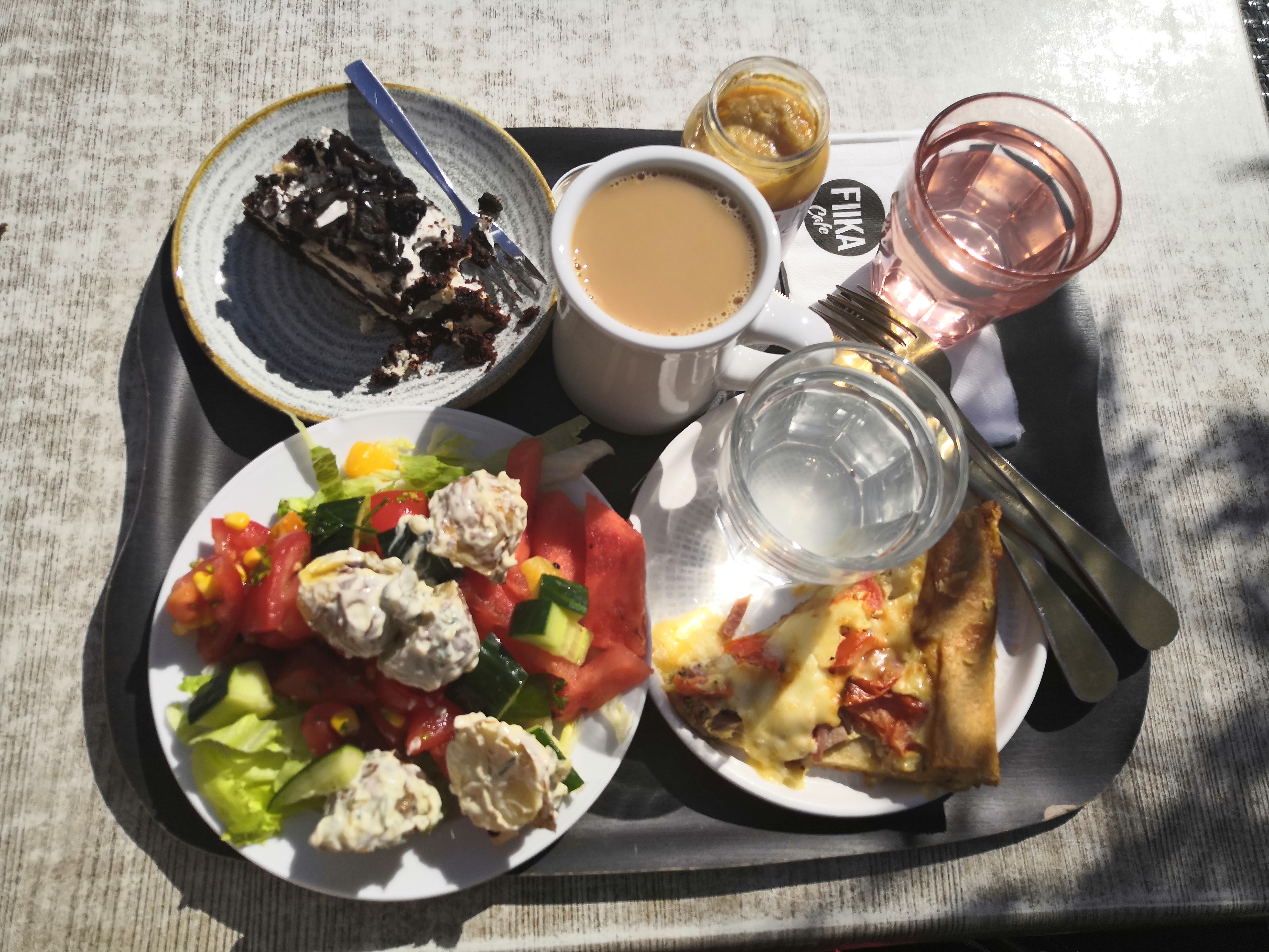 Pietarsaaren keskusta on pieni ja tunnelmallinen. Tuntuu siltä, kuin olisin ulkomailla tai vähintään lomalla, vaikka olen vain päiväretkellä kotoa käsin. Istun kahviloissa enimmäkseen vain ulkomailla, joten siitä se fiilis kumpuaa (pitäisi käydä useammin, jopa omassa kotikaupungissa!). FIIKAssa on houkuttelevan näköisiä piirakoita, salaatteja ja leivoksia. Nautimme herkullisen lounaan FIIKAn terassilla paikallisen paahtimon Roger’s kahvin kera, nam!
