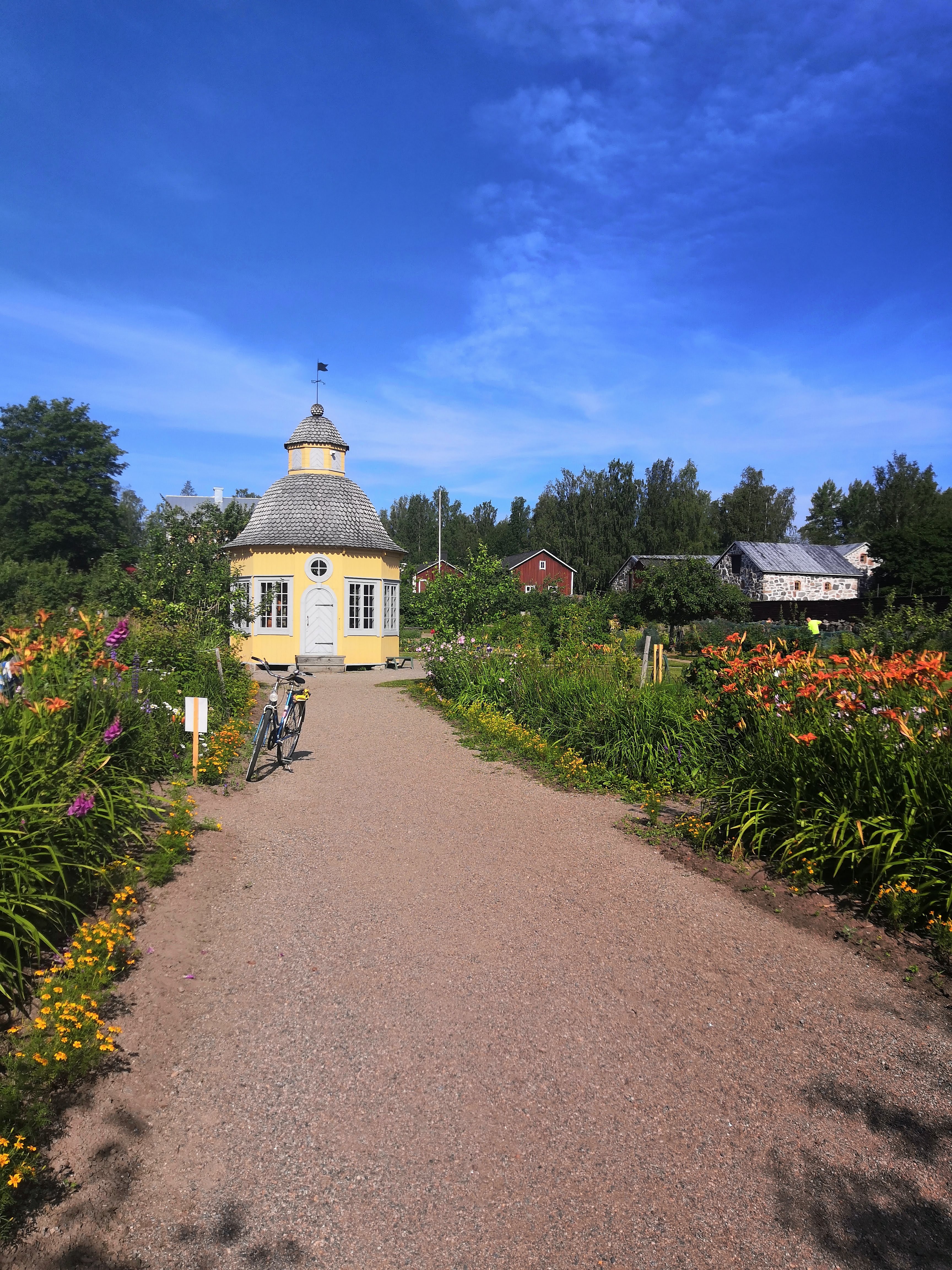 Lähden aamulla lasten kanssa ajamaan kohti Pietarsaarea ja olemme perillä jo ennen klo 10. Suuntaamme suoraan Aspegrenin puutarhaan, sää on aurinkoinen ja lämmin. Puutarha sijaitsee aivan Pietarsaaren keskustan tuntumassa, se on perustettu 1700-luvulla ja on siten Suomen vanhimpia pappilaputarhoja. Pihapiirissä on kivinavetta, jossa on kotiseutumuseo sekä Rosenlundin pappila, joka toimii myös lounas ja tilausravintolana. Sisäänpääsymaksua ei ole, vaan alueella on vapaa oleskelu sallittu klo 6-22 välisenä aikana.