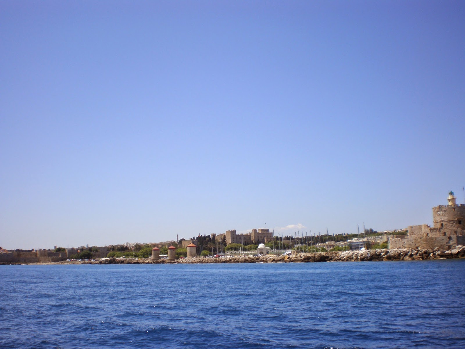 Vihdoin ja viimein oli kukkulan takana elämää, näkyi ranta, ravintoloita ja katuja. Jess, takaisin sivilisaatiossa. Mikähän tuo paikka oli. Menin läheiseen ravintolaan syömään, koska maha kurni tässä vaiheessa jo hirveästi. Kysyin tarjoilijalta että missä mahtaa Rodoksen kaupunki sijaita? Hän kysyi hämmentyneenä että vanha kaupunkiko? Olin että ei, vaan haluan mennä Rodoksen kaupunkiin. Tarjoilija katsoi vielä hölmistyneenä ja sanoi että sinähän olet Rodoksen kaupungissa. Tuli vähän fiilis että hei Uuno Turhapuron sisko Rodoksella terve. Olin kävellyt Rodoksen kaupunkiin n. 4km rantareittiä pitkin.