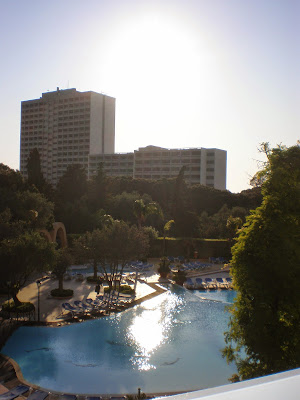 Hotellia ympäröi hieno ja iso puistoalue, jossa oli mahdollisuus esimerkiksi tennikseen ja minigolfiin. Hotellikin oli lähellä rantaa. Viereiset huonenaapurit olivat maksaneet matkasta pari päivää aikaisemmin 150,00 € kun minä monta viikkoa aikaisemmin muistaakseni n. 300-350,00 €. Hintaan ei sisältänyt aamiaista, joten sai hommata itse aamupalavärkit huoneeseen, johon kuului tottakai myös mansikkamaito.