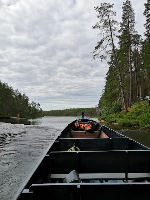 Aamulla olisi uni maistunut pitkään, mutta nousimme kiireellä ylös jotta ehtisimme ilmoittautua Ravadasköngäkselle lähtevään veneeseen. Veneet olivat jo täynnä, mutta rannalla odotti sen verran monta ei ilmoittautunutta, että paikalle kutsuttiin vielä neljäskin vene. Normaalisti reittiä kulkee vain 1 vene kerrallaan, mutta tänä kesänä oli kysyntä suurta. Toinen vaihtoehto olisi ollut muutaman kilometrin pituinen miniristeily Lemmenjoella, mutta halusin päästä syvemmälle kansallispuistoon.