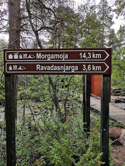 Lemmenjoki Lumon leirintäalue oli aivan kuin jostain suomi elokuvasta, paikassa oli sellainen vanhanaikainen ja turvallinen mummonmökki tunnelma, rantasaunan tuoksukin oli aivan ihana ja toi mieleen lapsuuden kesät mummolassa. Pystytimme tänne leirin ja lähdimme vihdoinkin patikoimaan! Mieli olisi niin kovasti tahtonut lähteä vaeltamaan 16 km pituisen Joenkielisen rengasreitin, mutta se oli tälle kokoonpanolle vain mahdottomuus, kantorinkan puuttumisen, koiran nivelten ja oman raskauden vuoksi. Täällä oli kuitenkin 4,1 km pituinen luontopolku joka oli aivan nappi valinta tällä kertaa.
