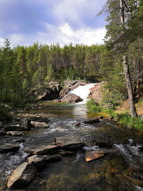 Venematka kesti n. 40 min ja siinä ehti itsekin imeä itseensä näitä erämaisia, metsäisiä harjumaisemia jotka muistuttivat yllättävän paljon kesän Ruunaan koskien maisemia. Perillä oli n. tunti aikaa tutustua Ravadasköngäksen lähimaastoon. Suurin osa muista matkaajista todennäköisesti valitsivat iltaveneen takaisin tai sitten he päättivät kävellä täältä kultahaminaan, mihin ei ollut kuin vain 5,8 km matka, sieltäkin lähtee vene takaisin Njurgulahteen. Ravadasköngäksellä suurin nähtävyys oli sen vesiputous, joka oli ihan sataman vieressä. Täältä lähti jyrkät portaat eteenpäin kohti muita polkuja, olisi ihania reittejä patikoida pidempiäkin vaelluksia. Kannattaa kuitenkin kiivetä myös rappuset ylös, sillä vesiputous jatkuu pitkästi sen jälkeen.
