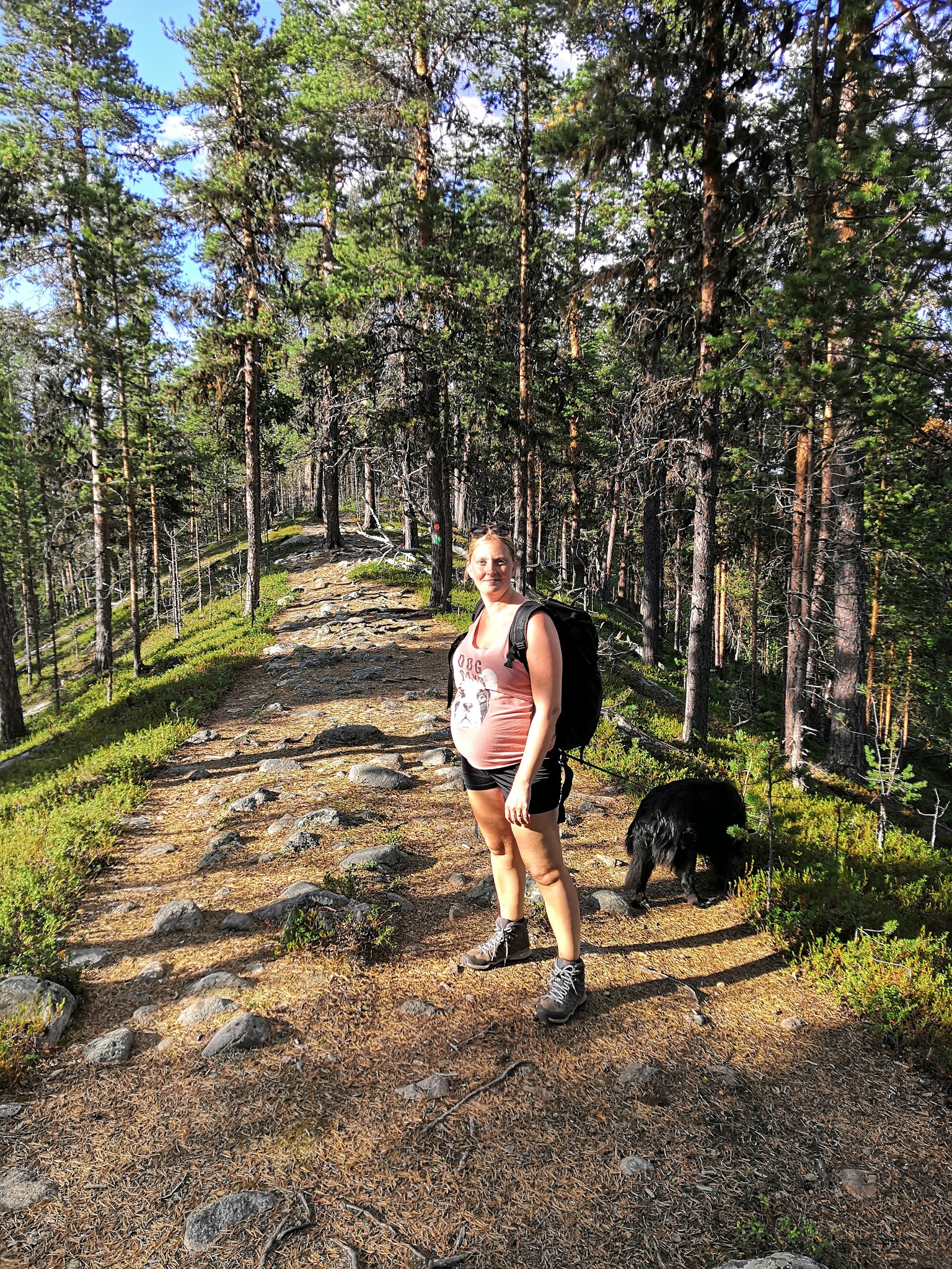 Lemmenjoki Lumon leirintäalue oli aivan kuin jostain suomi elokuvasta, paikassa oli sellainen vanhanaikainen ja turvallinen mummonmökki tunnelma, rantasaunan tuoksukin oli aivan ihana ja toi mieleen lapsuuden kesät mummolassa. Pystytimme tänne leirin ja lähdimme vihdoinkin patikoimaan! Mieli olisi niin kovasti tahtonut lähteä vaeltamaan 16 km pituisen Joenkielisen rengasreitin, mutta se oli tälle kokoonpanolle vain mahdottomuus, kantorinkan puuttumisen, koiran nivelten ja oman raskauden vuoksi. Täällä oli kuitenkin 4,1 km pituinen luontopolku joka oli aivan nappi valinta tällä kertaa.