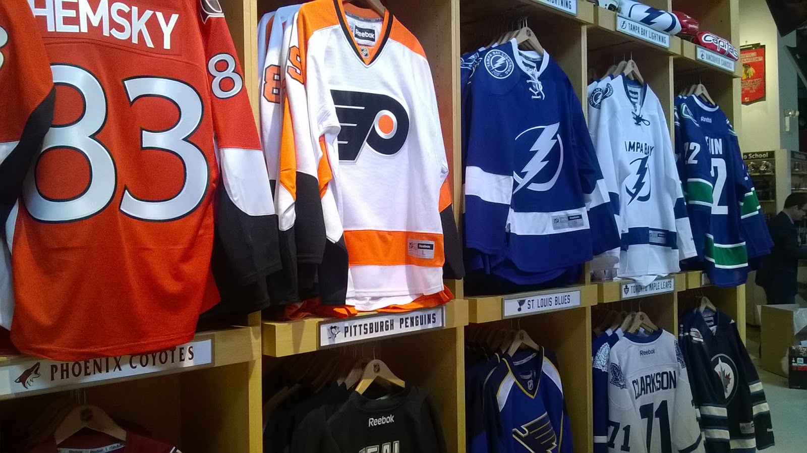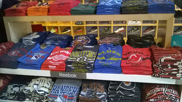 Päivällä ennen peliä kävimme hypistelemässä NHL kaupassa, vaikken mikään jääkiekkofani olekaan, niin olihan se liike ihana! Lippiksiä, T-paitoja, pelipaitoja, kiekkoja yms. En kuitenkaan ostanut mitään vaikka Wildin ja Flyersin pipoja sovittelinkin. Sain sieltä kuitenkin mukaani kunnon (NHL) lätkähuuman!