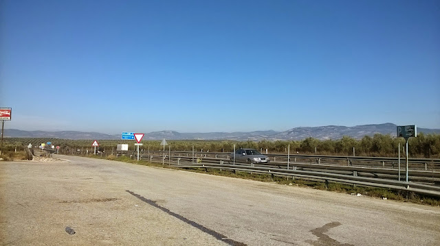 Ajoimme mennessä Malagan yläkautta kohti Granadaa ja Sierra Nevadaa. Voin kertoa että inhosin istua autossa, koska niin jännitti paikallinen liikenne. Usein yritin katsoa vain sivulle maastoon, enkä liikenteeseen ollenkaan, välillä pidin silmiä kiinni ja paluumatkalla pidin tarkoituksella pipoa silmillä. Ei mutta oikeasti, pelotti tosi paljon. Vaikkei se liikenne todellakaan ole mistään pahimmasta päästä! Oli vaan niin monta kaistaa ja autoja joka puolella, suuret nopeudet ja lyhyet turvavälit. Koko ajan olin varma että kohta rysähtää! Huh. (ehkä tämän takia en ollut niin levännyt suomeen päästyäni).
