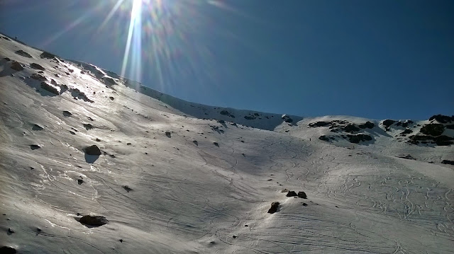 Alas oli tultava! Rinne oli merkitty punaiseksi, mutta tuntui mustalta ja oli hyvin vaativa ja raskas tulla alas, rinne oli aika jäinen. Ehkäpä jälleen ohuemman ilman vuoksi, jouduin huilaamaan useamman kerran, ennenkuin olimme taas hieman alempana. Oli niin raskas lasku, että tilanne vaati taas uuden oluen. Borreguilesin rinneravintolaan siis taas.