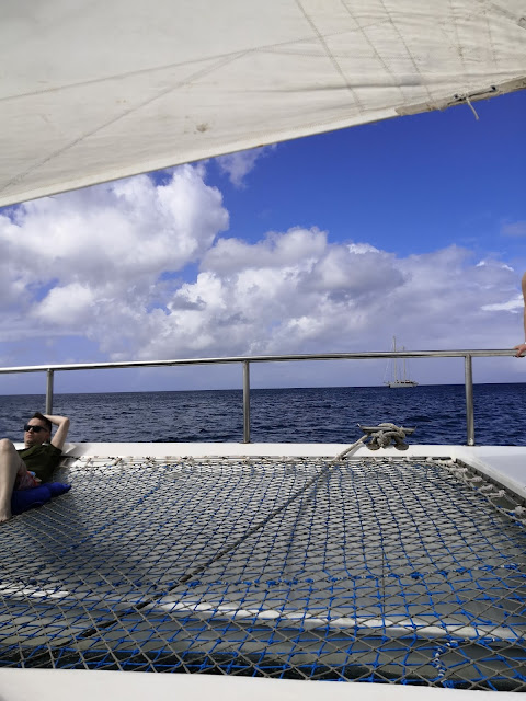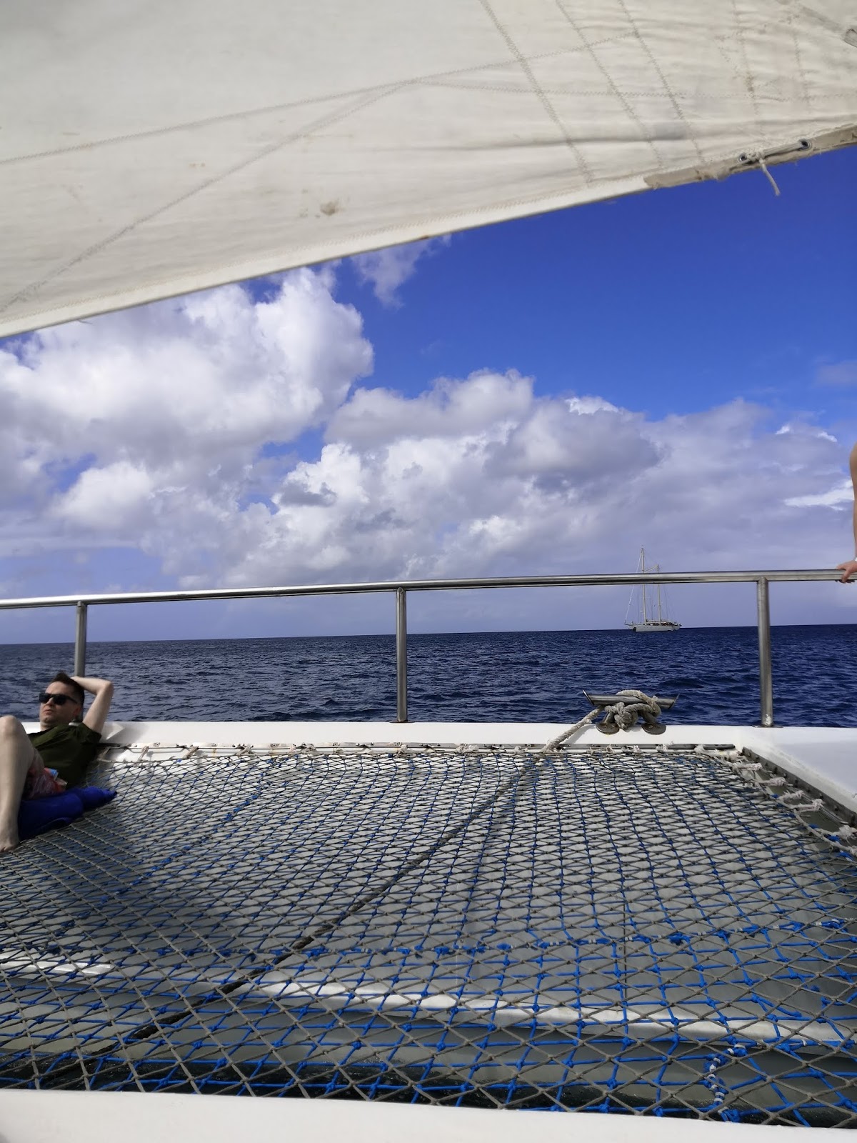 Lähdimme katamaraanilla matkaan, oli puolipilvinen sää ja välillä tihutti vettä, mutta silti niin lempeän lämmin tuuli. Tyttö kaivautui äidin kainaloon ja rupesi nukkumaan 10-minuuttia lähdön jälkeen. Hän nukkui, vaikka katamaraanilla soitettiin musiikkia ja tanssittiin ja heräsi kun 1½ tunnin päästä saavuimme Saonan saarelle, matka nopeutui puolella tunnilla myötätuulen vuoksi. Nautin jälleen kerran ihan mielettömän paljon katamaraani kyydistä, niin rentouttavaa ja leppoista. Sen kyydissä olisi kieltämättä ollut varmasti aika ihanaa ottaa päiväunet.