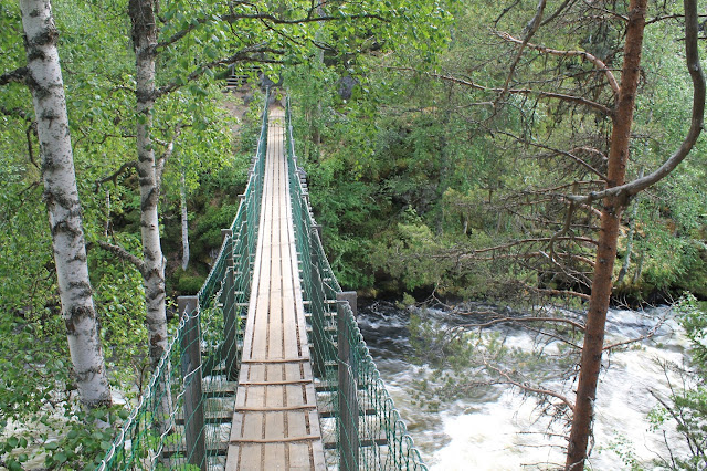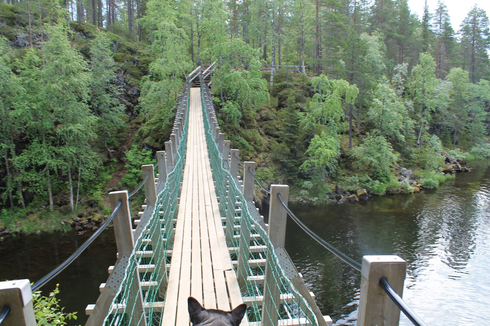 Niin ja paljon riippusiltoja! Yksi meidän kolmesta koirasta pelkäsi ihan tosissaan ylittää riippusiltoja, selkä matalalla ja jalat täristen hiipi varovaisesti eteenpäin. Onhan se jännittävä kokemus koirallekin, kun sillan alapuolella pauhaa vilkas koski. Kaksi muuta koiraa hieman vain ihmettelivät aluksi uutta tilannetta mutta rohkeasti tulivat yli.
