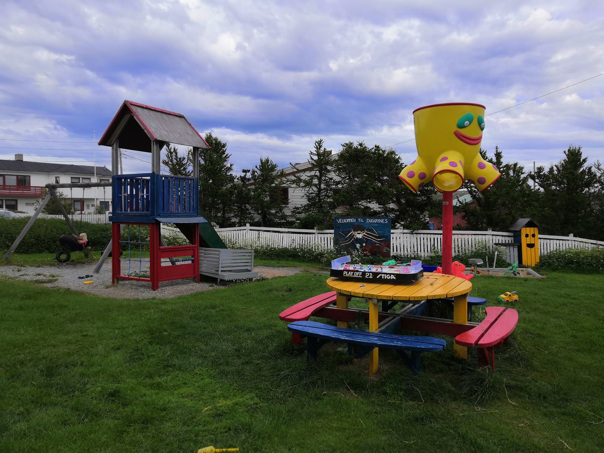 Tyttö alkoi heti leiriin saavuttuaan puhumaan siitä, että hän haluaa lähteä vuorelle, joten lähdimme kävelemään Pykeijan kukkulalle. Polku sinne alkoi Pykeijan perältä, mistä löytyi myös sopiva leikkipuisto, mihin luonnollisesti pysähdyimme mennen tullen. Tyttö käveli itse koko matkan ylös kukkulalle, olihan polku todella helppokulkuista ja loivaa nousua. Kävelimme ylös hissukseen lapsen tahtiin ja seurasimme lukuisia valkoisia perhosia ja lueteltiin niittykukkien värejä. Aikuisen vauhtiin ylös käveleminen olisi kestänyt korkeintaan 5-10 minuuttia.