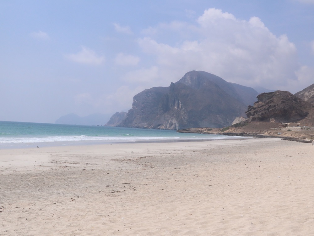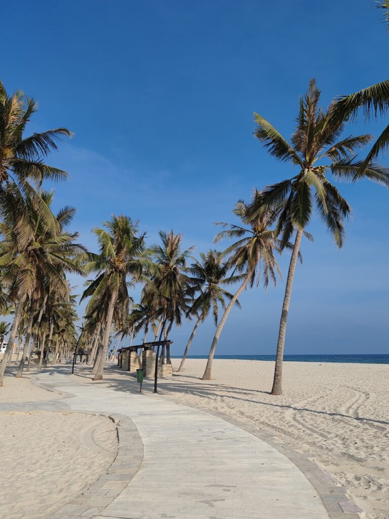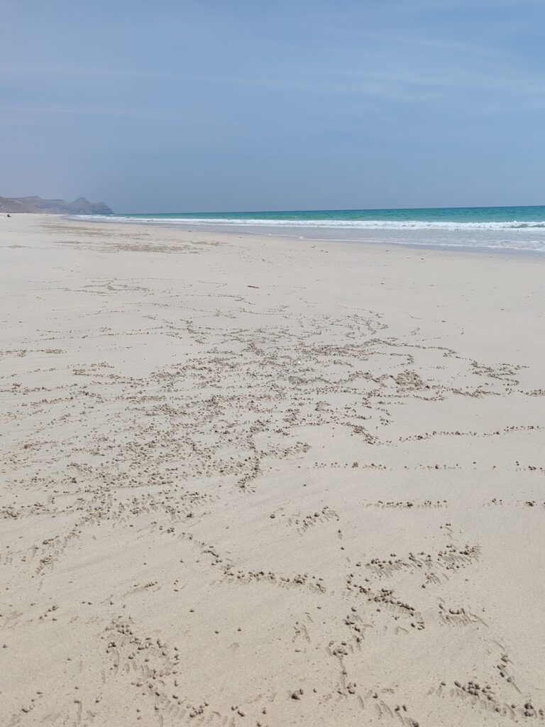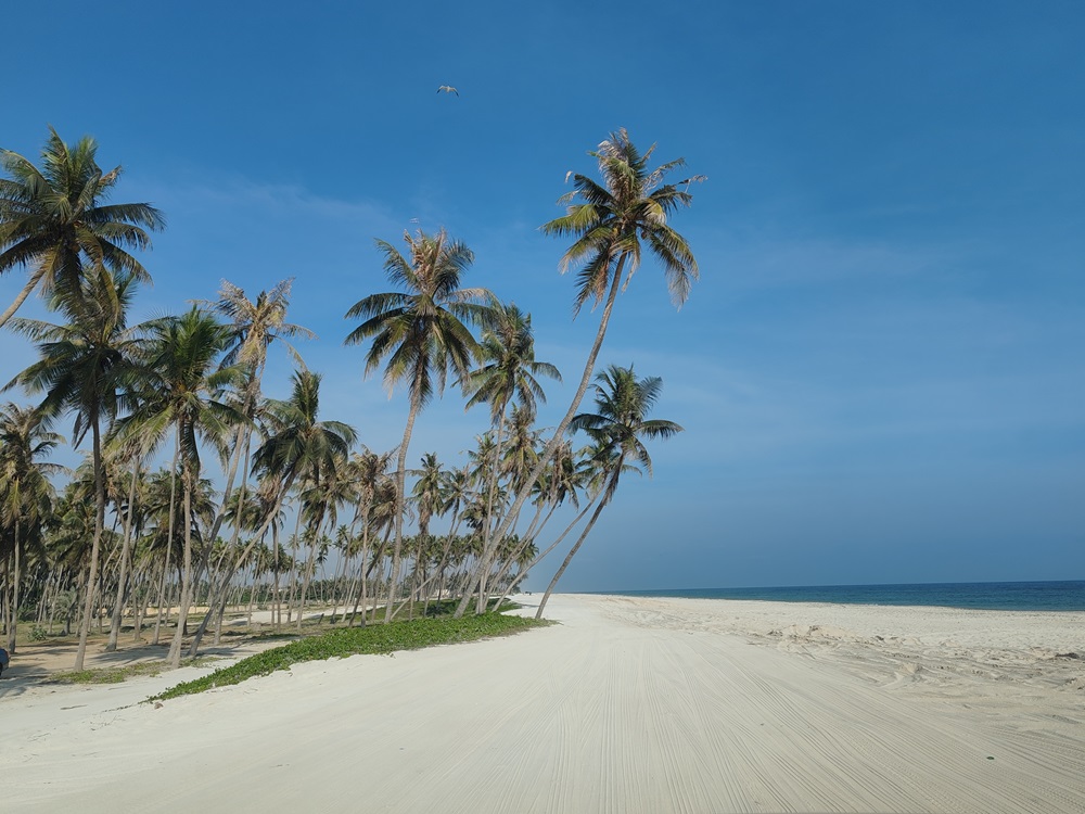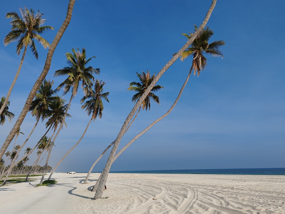 Tie johti Alhafa rannalle, jossa yllätykseksemme tie jatkui kirjaimellisesti rantahietikolle asti. Hiekkatie oli painautunut niin, että sillä pystyi ajaa myös autolla. Edessämme avautui upea palmunäky, joka muistutti lähinnä lapsuuteni palmujulisteita.