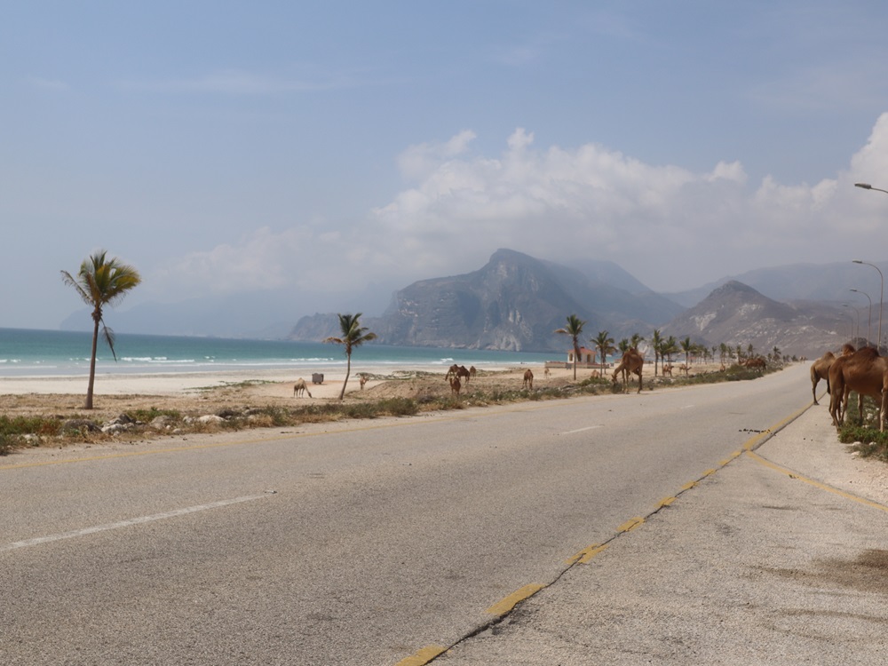 Eteemme käveli useita kymmeniä kameleita, keskellä tietä. Pysäytimme auton levikkeelle ja hyppäsimme autosta pois ihastelemaan näkyä. Oli ihan mielettömän kaunis näky: turkoosi meri, vaalea hiekkaranta, taustalla tumma vuoristo ja tiellä käveli kameleita.