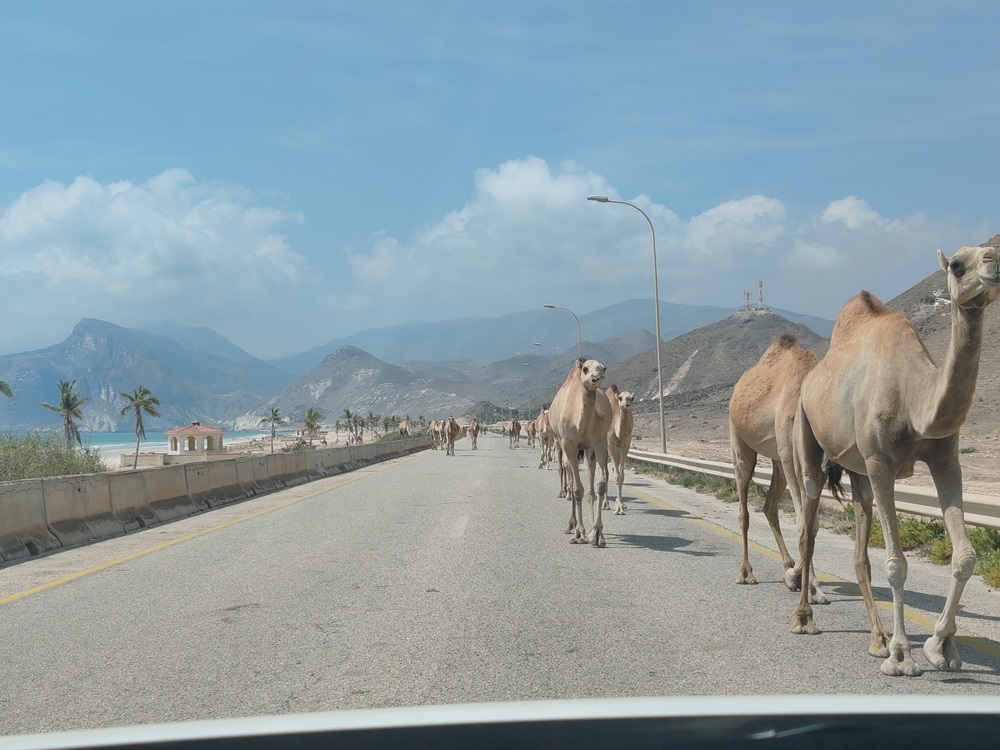 Emme olisi malttaneet jatkaa matkaa, mutta kun suurin osa kameleista oli jo meidät ohittanut, jatkoimme matkaa. Omanissa tuli aina autolla ajaessa laittaa hätävilkut päälle mikäli kameleita tai muita eläimiä käveli tiellä.