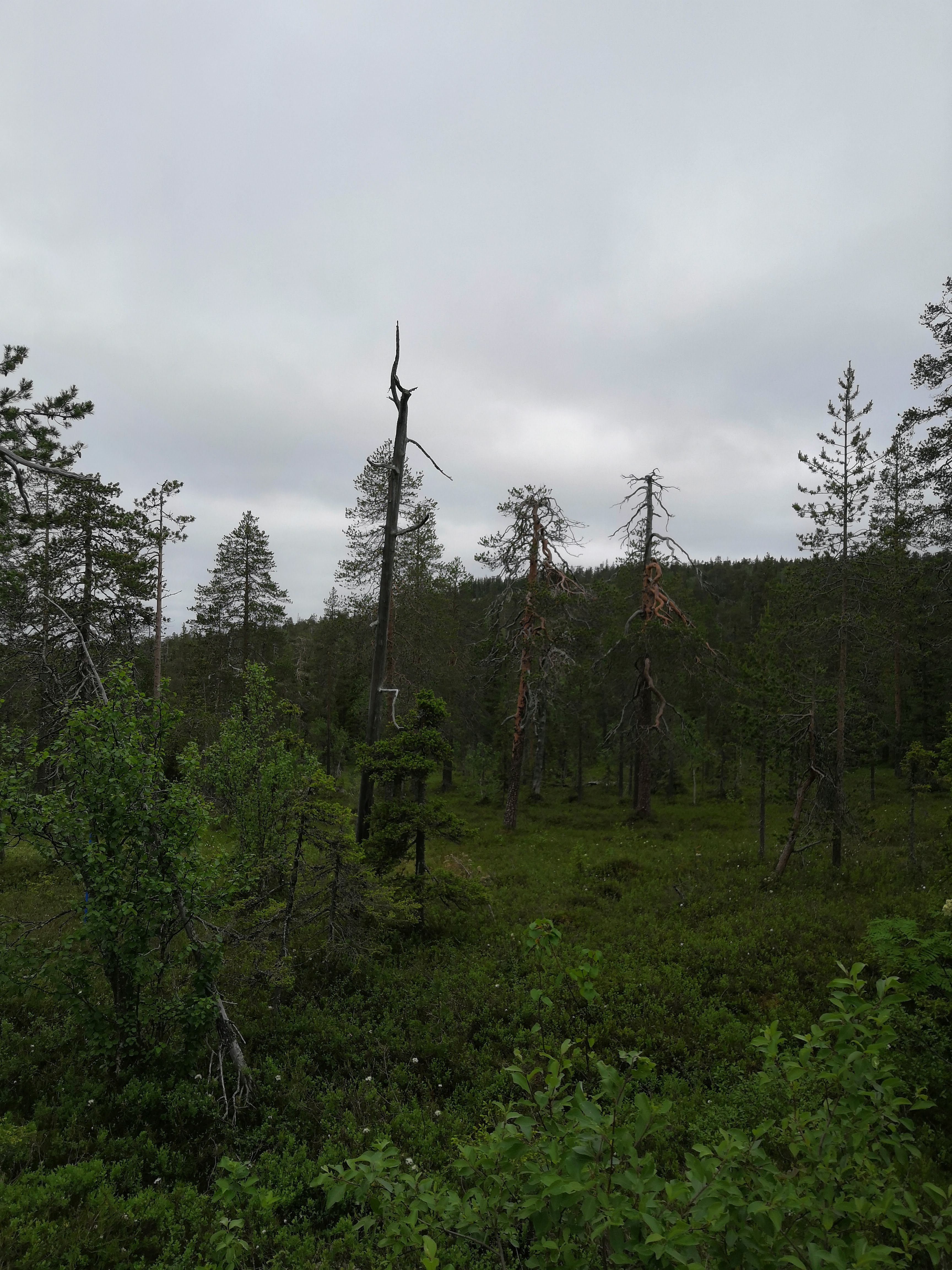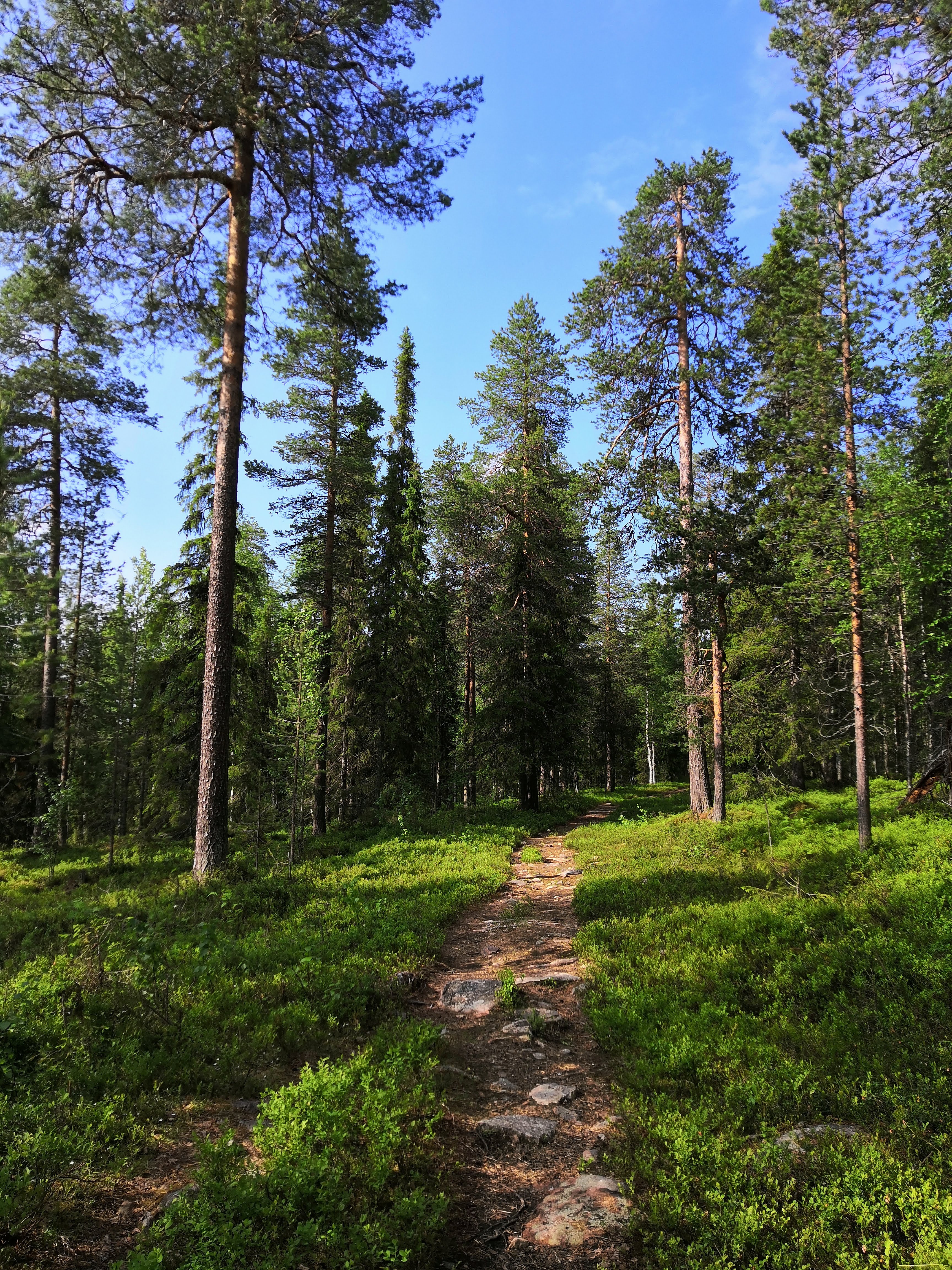 Lähdemme Sallaisen pihasta vasemmalle yhdessä parin koiranulkoiluttajan kanssa rupatellen ja päädymme kulkemaan kapeaa ja jyrkkää metsäpolkua ylöspäin. Seuraan karttaa, sillä olen löytänyt talvireitin (keskellä kesää haha) ylös huipulle pohjoisrinteiden kautta. Kävelemme tunturin kivikkoista reunaa metsän keskellä, kunnes polku päättyy pohjoisrinteelle, sitä lähdemme kiipeämään ylös.