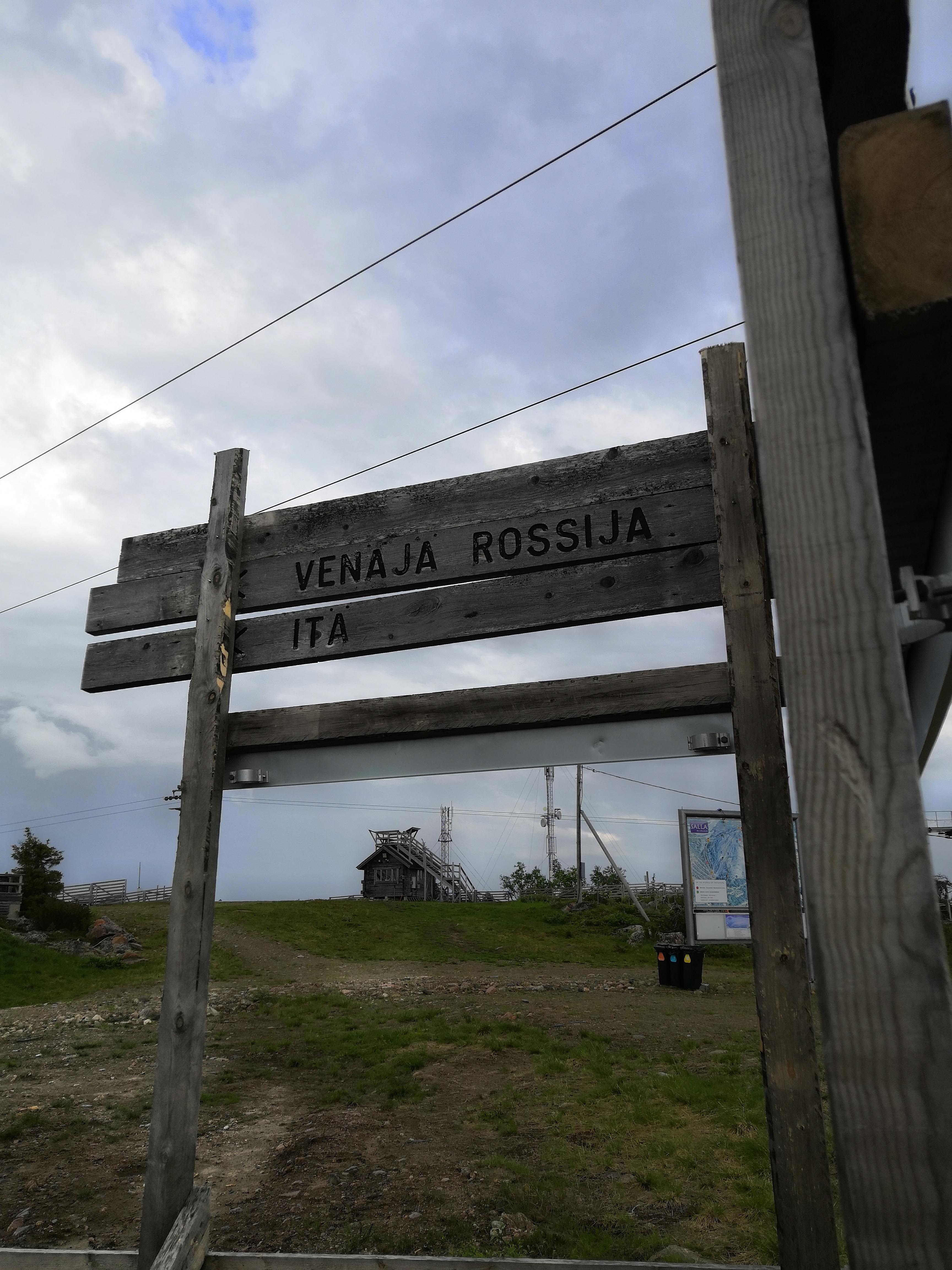 Ylhäällä tähyilen kylttiä joka puskan takaa, mies ja tyttö jää kivelle odottamaan, heille ei ole niin tärkeää löytää kylttiä. Tyttö rakentaa sillä välin hyttysille kodin kivistä. Lähden vauva selässä kävelemään kohti laskettelukeskuksen korkeinta huippua. Ensin vastaan tulee viitat Venäjän suuntaan, sen jälkeen näkyy joitain rakennuksia kuten kotaa ja katselutasannetta ja pian niiden jälkeen havaitsen viimein In the middle of nowhere kyltin. Hahaa, mikä ilo kun viimein sen löysin!