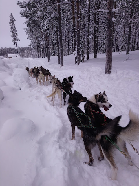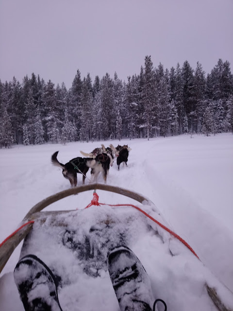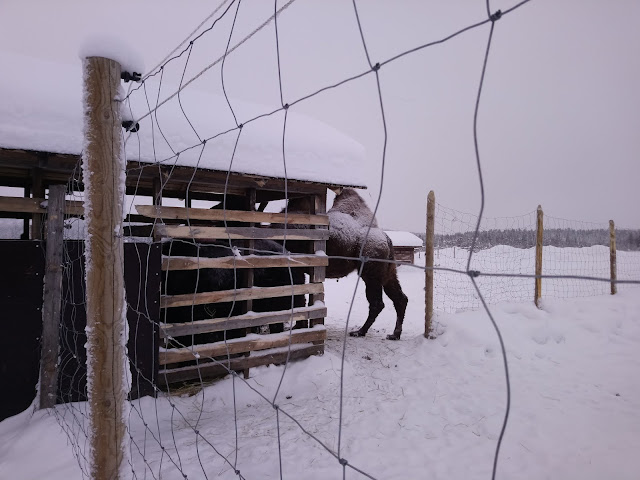 Konijänkän kotieläinpiha oli tämän loman suurin kohokohta, kun päästiin mökiltä edes jossakin käymään vauvan kanssa. Konijänkkä sijaitsee Äkäslompolon puolella ja siellä oli poroja, pukkeja, lampaita, alpakoita, kameli (!) ja hevosia. Ensimmäistä kertaa elämässä kokeilin koiravaljakkoajelua, joka ajettiin Konijänkän lähimetsässä. Vauhti oli leppoisaa ja kyyti tosi kivaa! Reitti oli noin 1 km pituinen, kesti 10 min ja maksoi silloin 15 e/hlö (nyt 25e/hlö). Olisihan siinä voinut pidempäänkin istua, mutta sai pientä makua siitä, kuinka kivaa koiravaljakkoajelu voi olla! Ja todella helppoa vauvankin kanssa.