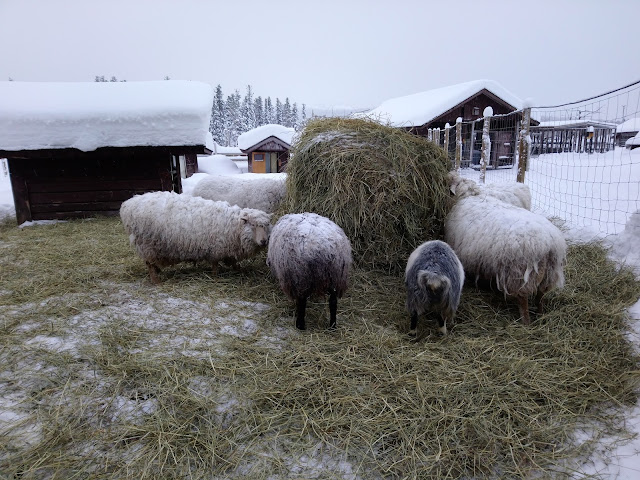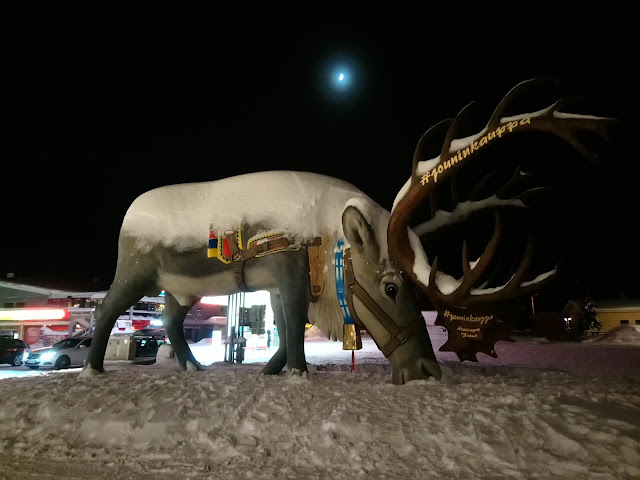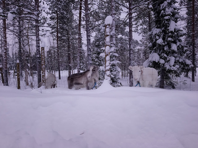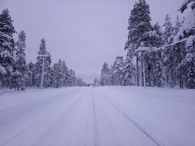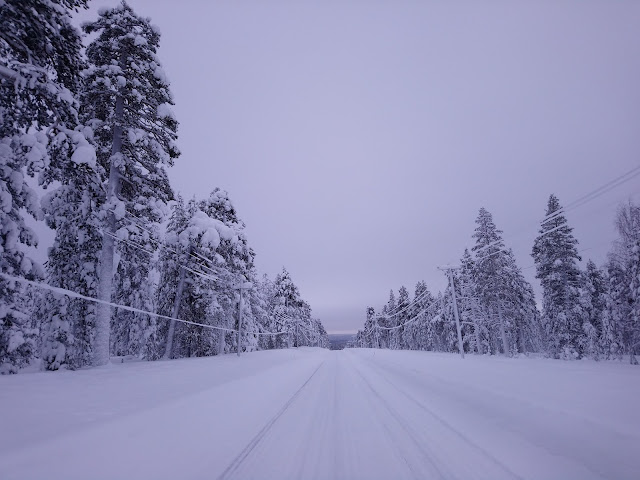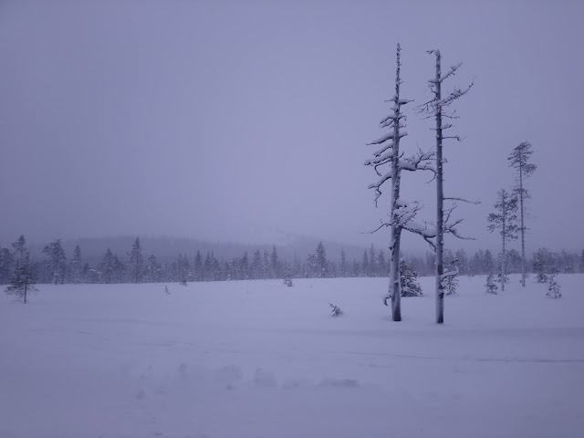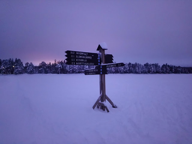 Maisemista sain nauttia, vaikka mikä olisi. Rakastan ulkoilla oikein kovilla paukkupakkasilla, se on niin leppoista kun on tarpeeksi vaatetta päällä, vain poskia hieman kiristää. Se on parasta! Vaikka pohjoisessa ei aurinko kovin montaa tuntia keskitalvella paistakaan (jos ollenkaan), niin valoa ei täältä puutu. Metrin lumihanget, lukuisat erilaiset siniset hetket ja niiden eri sävyt, tuo ihastuttavan paljon väriä. Täällä ei todellakaan ole pimeää, vaikka tosiasiassa se pimeys siinä klo 16 laskeutuukin, sininen hetki jatkuu kuutamon valossa. Kyllä nämä voittaa lumettomat, harmaat ja sateiset etelän talvet mennen tullen. Nautin kun sain ulkoilla lumihankien keskellä metsässä raikkaassa säässä.