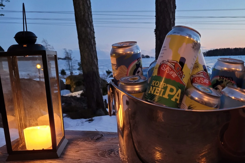 Lämminvesialtaalta on suora maisema merelle ja lankkupolulla on ihanat räsymatot tuomassa kotoisaa ja rentoa fiilistä. Kylmävesiallas piristi saunomisen välissä, oi että kuinka hyvää tekikään pulahtaa kylmään veteen pitkästä aikaa, ei olisi malttanut tulla ylös ollenkaan. Saunajuomaksi saimme nauttia paikallista Kotkalaista pienpanimo-olutta.