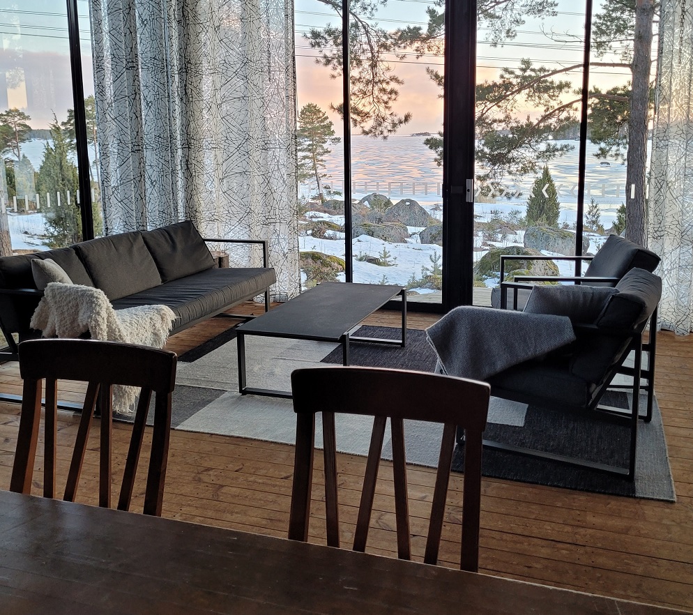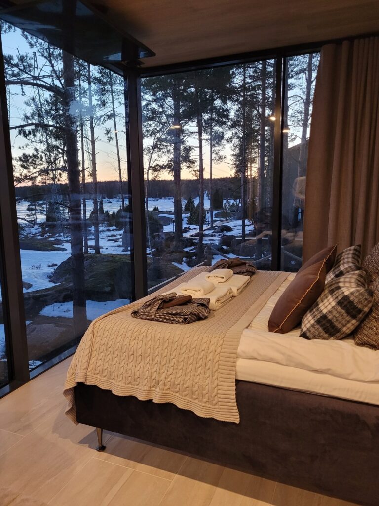 Glass Villan hintaan (1 yö 550 €, 2 yötä 790 €) sisältyy kaikki alueen vuokravälineiden käyttö ja aamiainen majoitukseen tuotuna. Tänne olisi ihana tulla lataamaan akkuja, päivän ulkoilujen jälkeen mennä sängylle rötköttämään ja maisemia ihastelemaan.