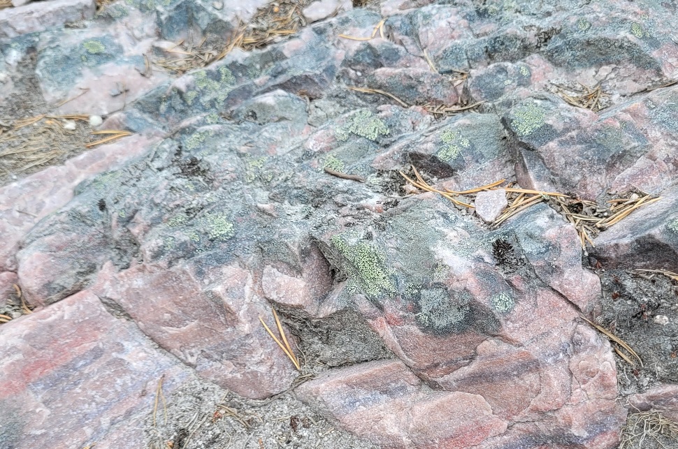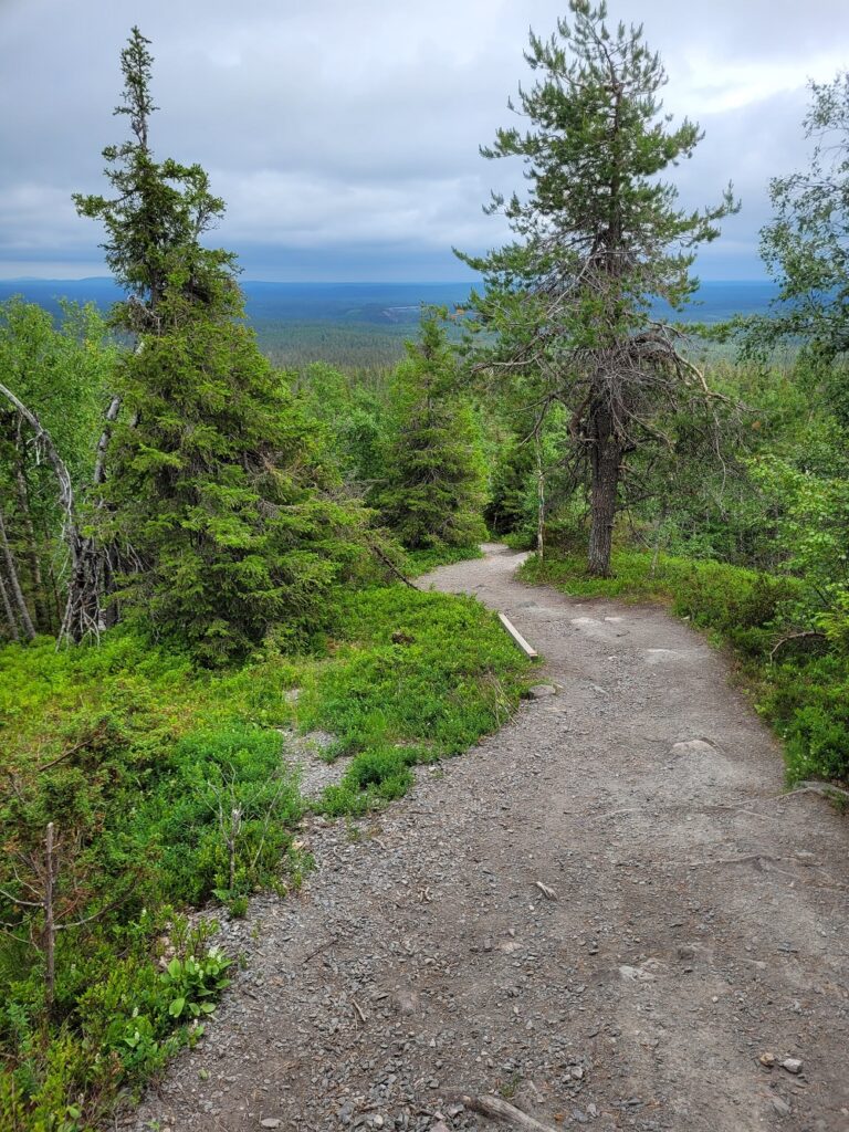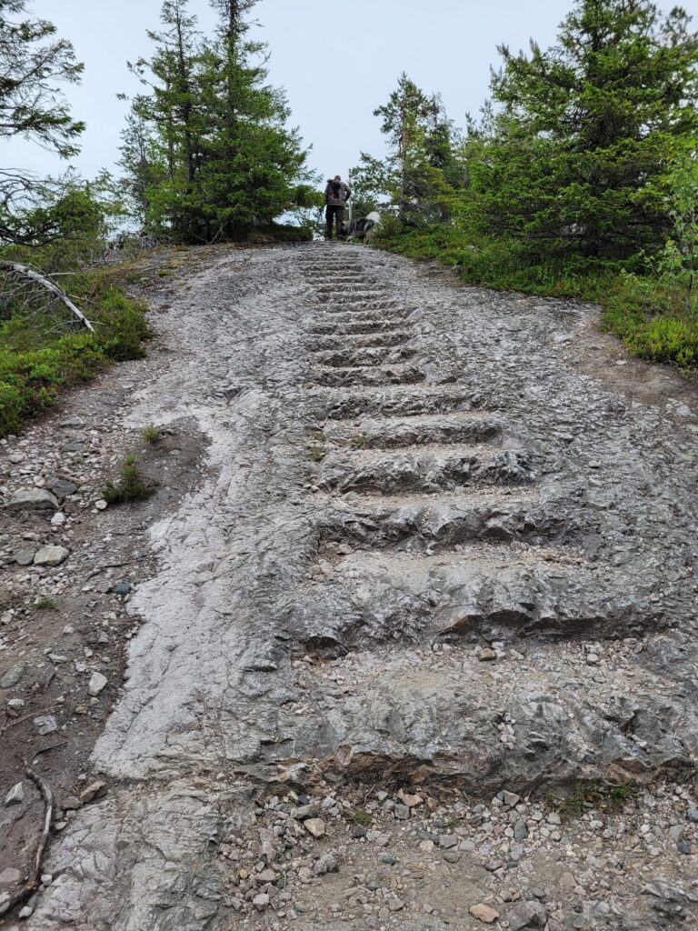 Reitin puolessa välissä näkyy jo hyvin Rukan maisemat. Kallio on paikoitellen pinkin musta ja alkoi heti tehdä mieli vadelma-lakritsi karkkia (täytyi patikan päätteeksi käydä kaupasta hakemassa). Rappuset on paikoitellen louhittu kallioon ja sateella reitti voi olla liukas ja mutainen.