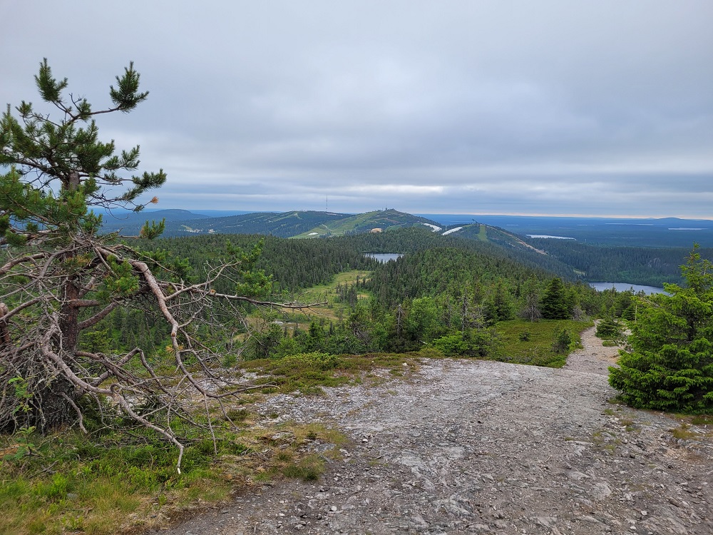 Onneksi maisemat alkoivat avautua melko pian, niin sai luonnollisen tauon pysähtyä ja tasata sykettä. Ensimmäiseltä näköalapaikalta avautuu jo maisemat Rukatunturin laskettelurinteille.