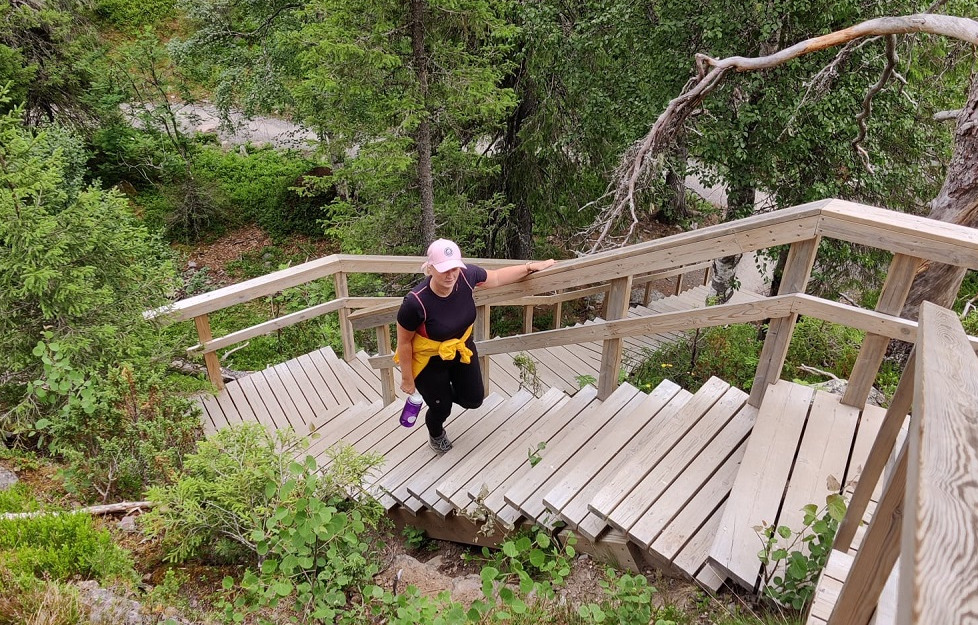 Meitä oltiin ennen reittiä varoiteltu, että reitin alku on koko reitin vaativin, joten osasin odottaa heti sykettä nostattavaa nousua. Se oli pitkä ja raskas nousu heti alkuun ilman lämmittelyä, nousu jatkoi vielä portailla.