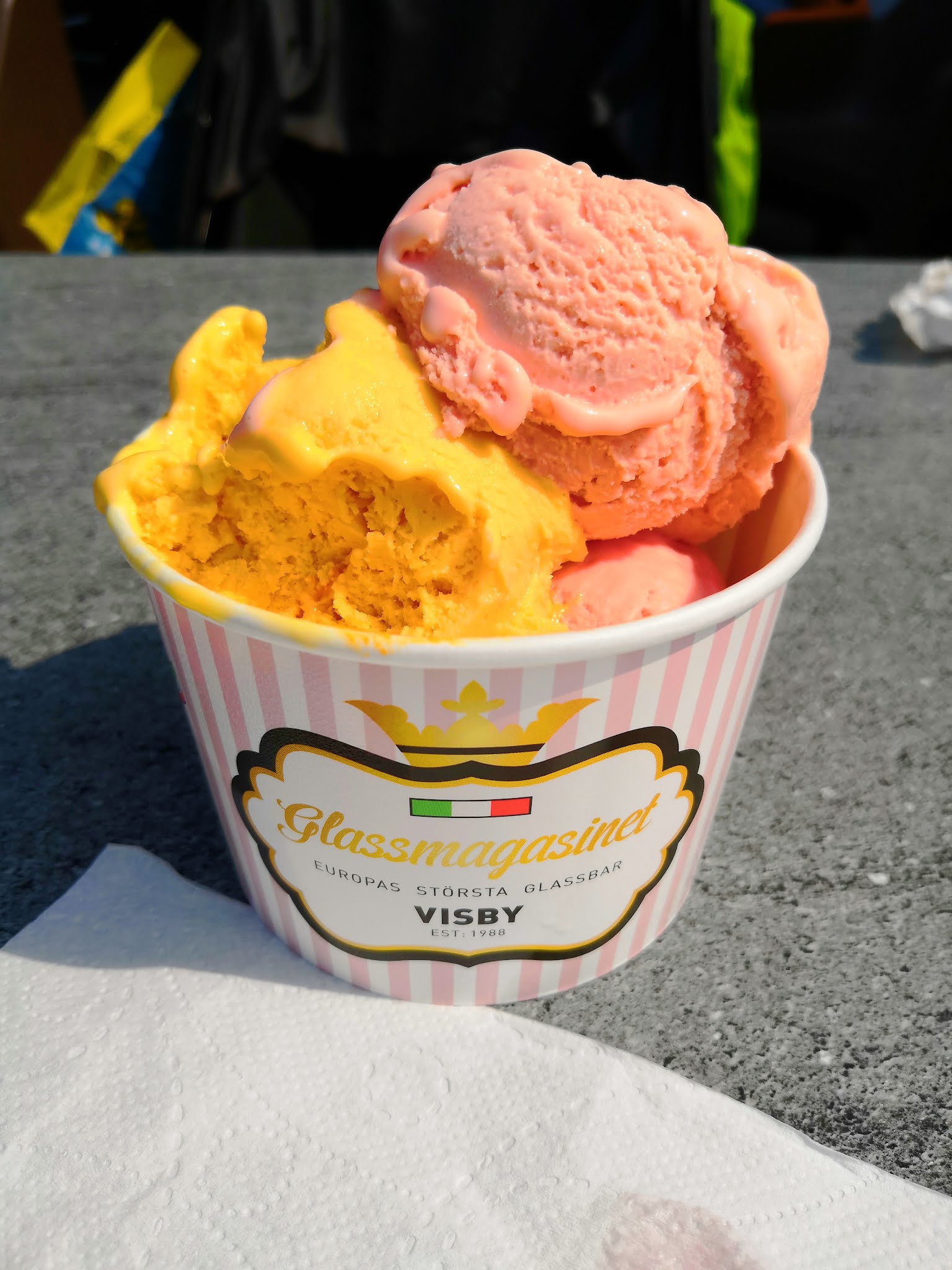 Glassmagasinetissä on eri jäätelömakuja yli 300 ja tämä Ruotsin ja Euroopan suurin jäätelöbaari sijaitsee lähellä satamaa. Mikäli saapuu Visbyhyn laivalla, niin tämä jäätelöbaari löytyy satamakadun varrelta. Makuja oli todellakin paljon, taisin ensimmäisellä kierroksella ostaa 3 eri makua ja sen jälkeen hain vielä 2 uutta makua, oli niin hyvää.