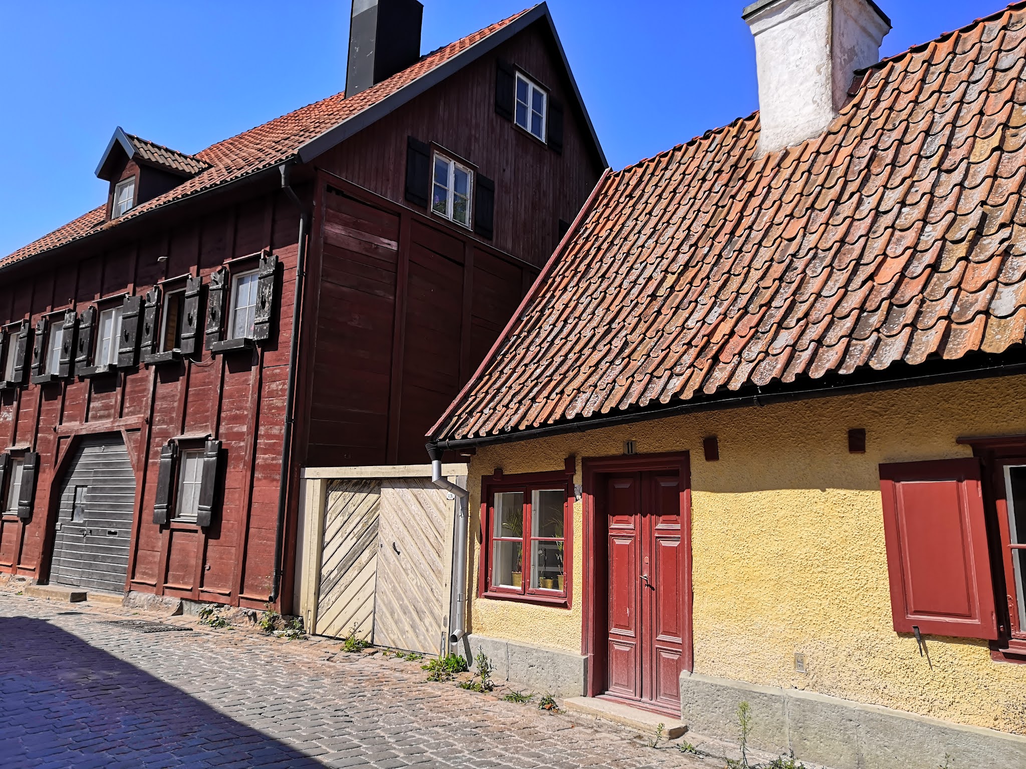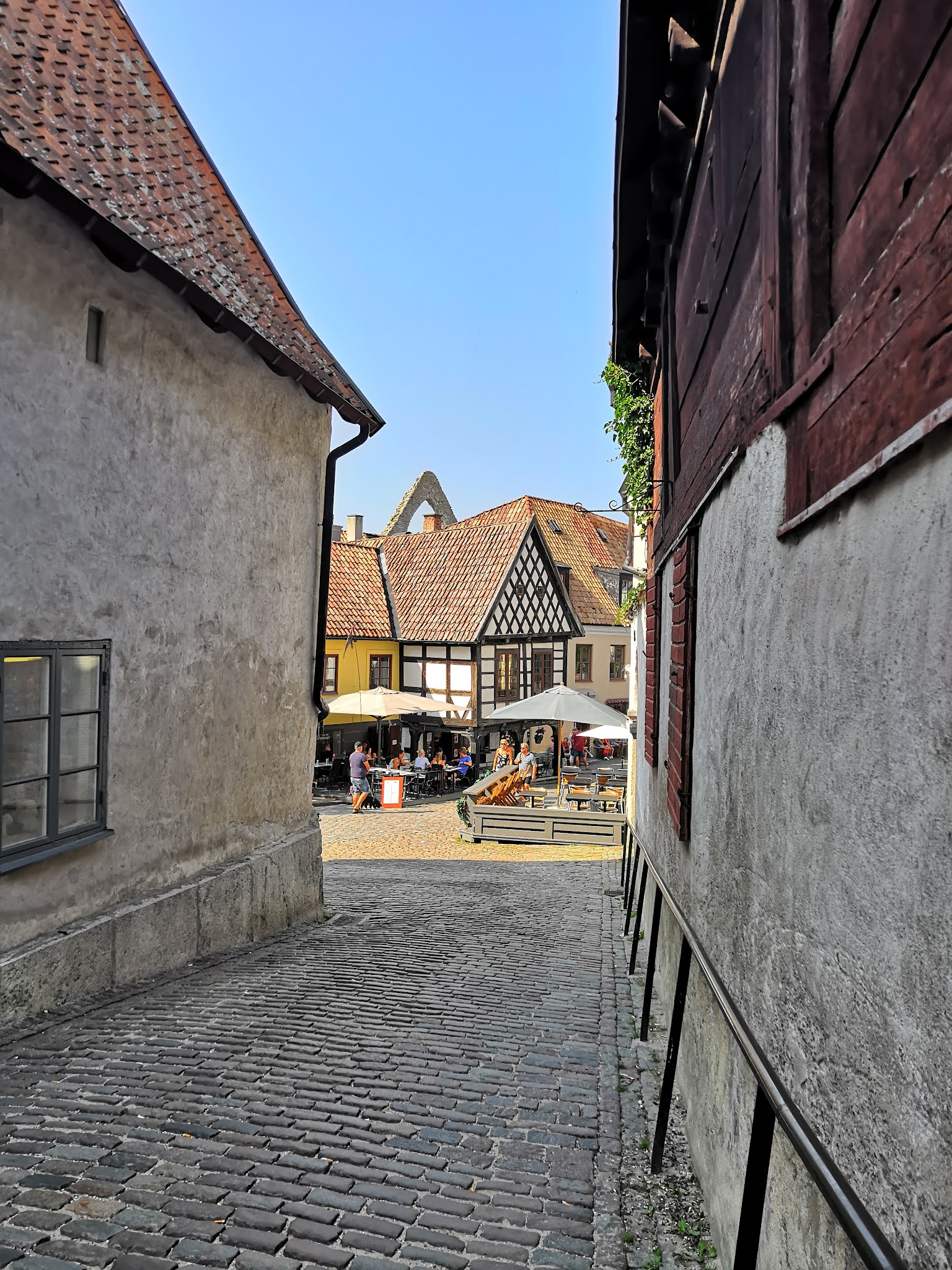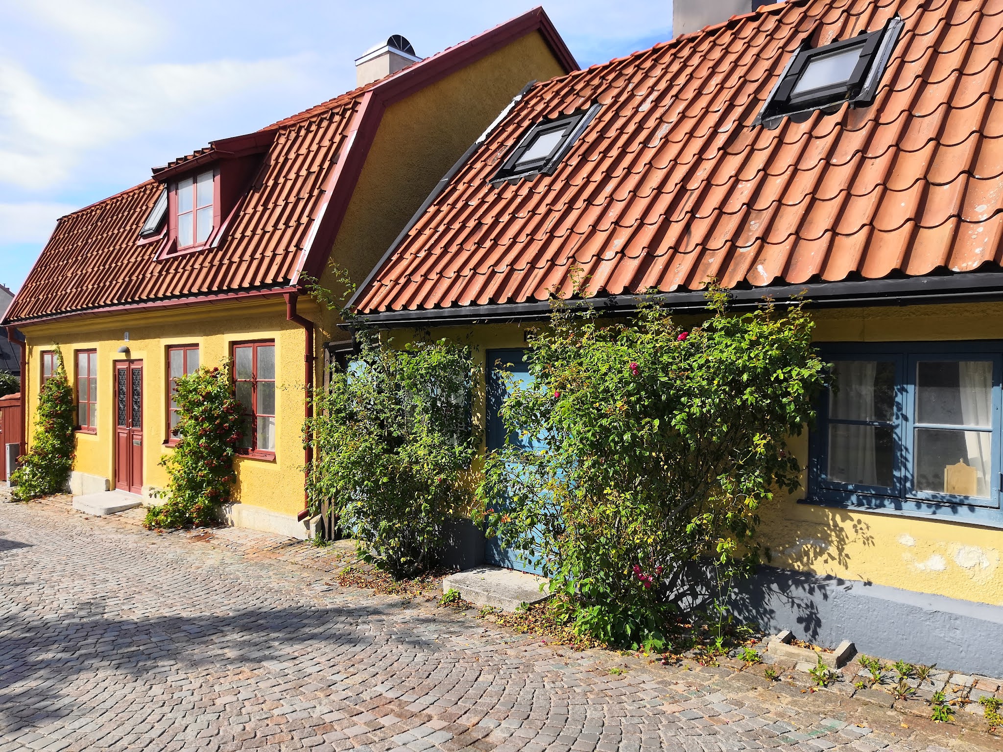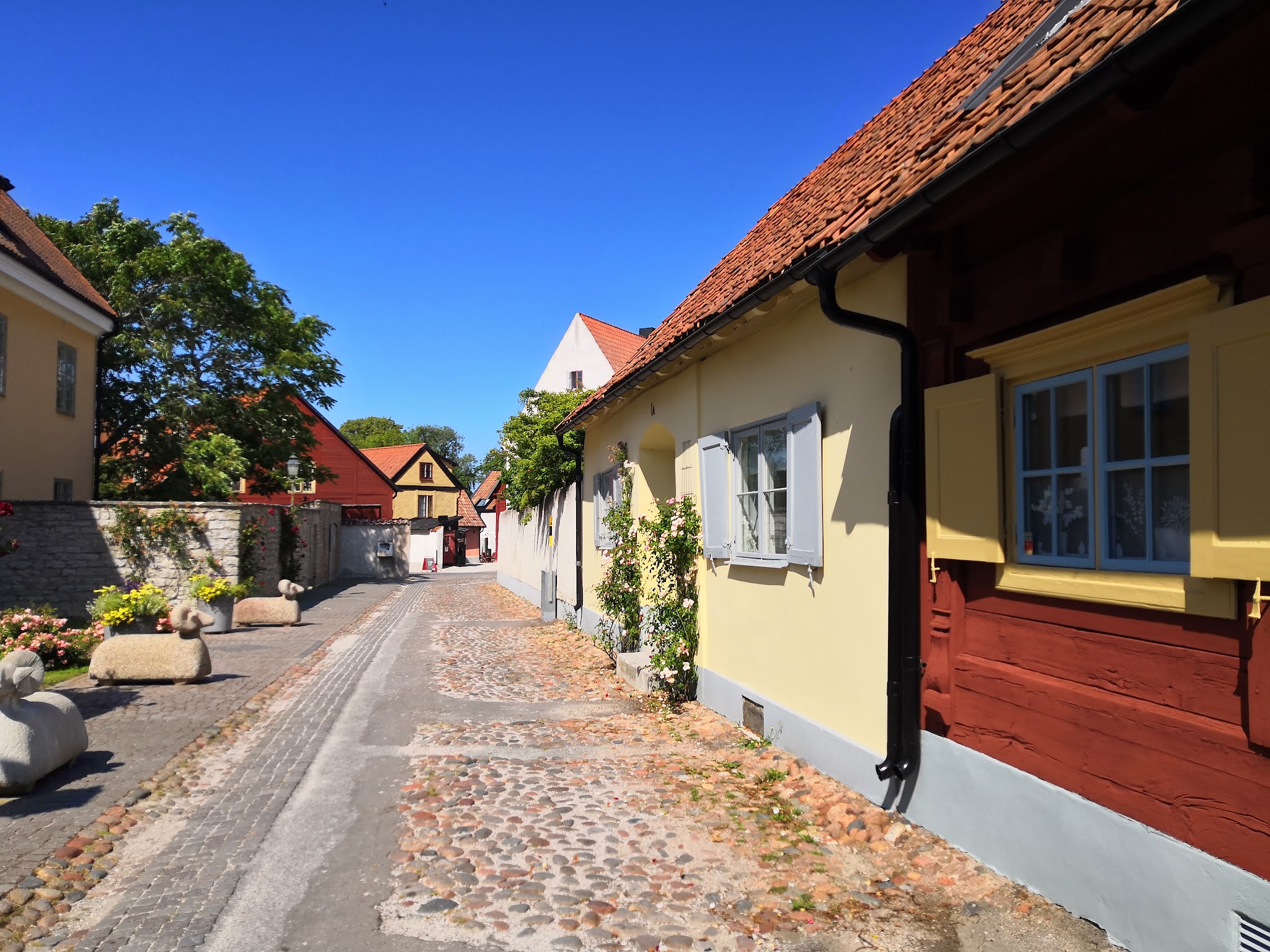 Vanhankaupungin tuoksu on ihana, sen vanhat puutalot tuoksui paikoitellen aidolta vanhaltakaupungilta, siihen tuoksuun harvemmin enää törmää. Tätä Visbyn vanhaakaupunkia ympäröi kehämuuri, joka on 3,5 km pitkä. Siinä on ollut 29 tornia, joista 27 on edelleen jäljellä, muuri on tuttu myös Peppi Pitkätossusta, missä Peppi ratsastaa muurin portin läpi. Paikoitellen muurin päälle pääsee myös kävelemään, mutta emme itse muurilla/torneissa käyneet kävelemässä. Vanhakaupunki on todella kaunis, mukulakivikatuja, ihania hiljaisia kujia, runsaasti keskiaikaisia punakattoisia taloja, jotka ovat mielestäni joka paikassa aina yhtä kauniita. Kaupungissa on myös historiallisia kirkkoja ja useita raunioita. Parasta on kiireetön tunnelmointi katuja hissukseen eteenpäin laahustaen, kerrankin meillä ei ollut mihinkään kiire.
