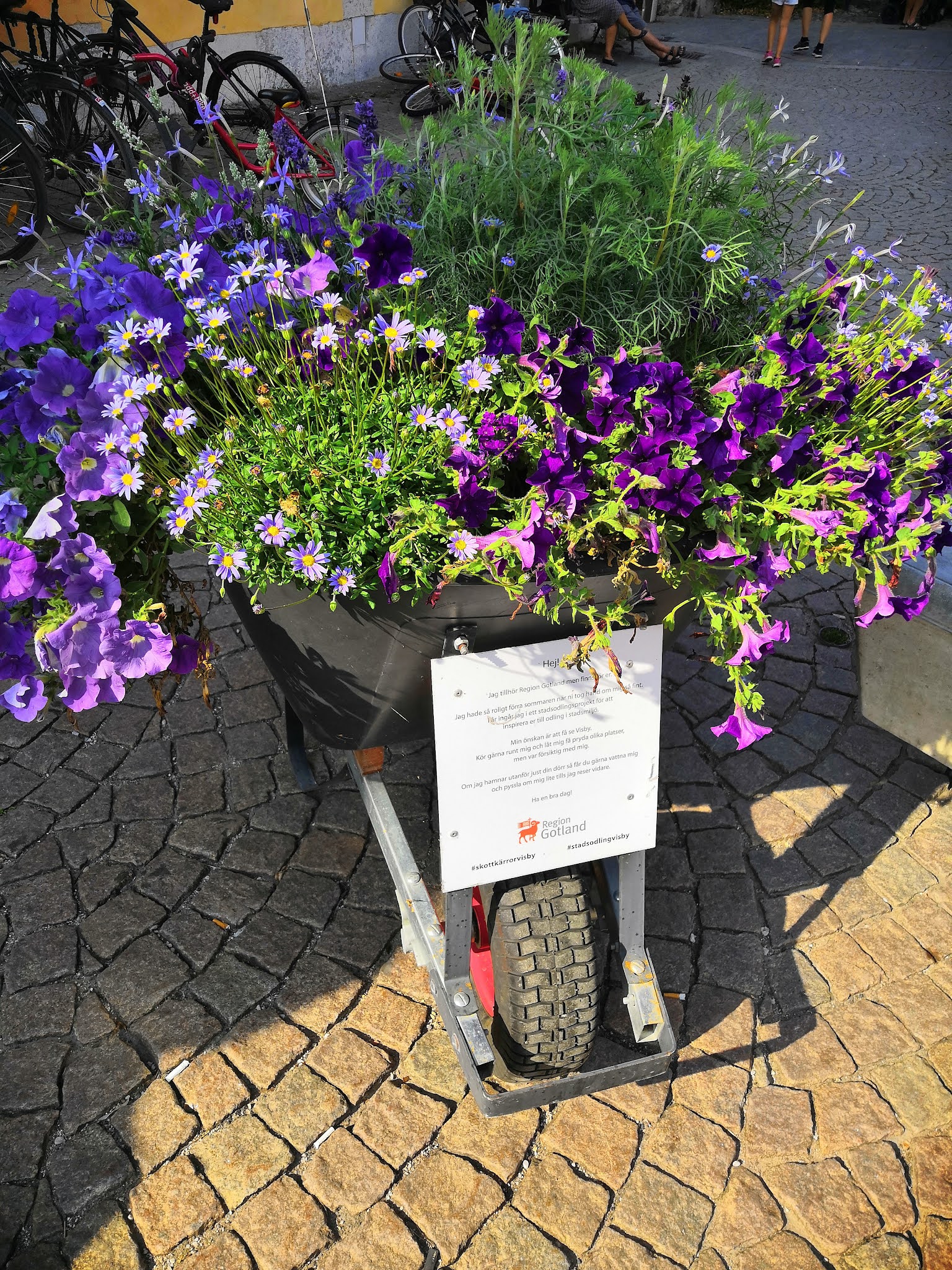 Kaupungissa turisti-infon edessä oli myös kukkia täynnä oleva kottikärry, jolla oli toivomus päästä näkemään Visbytä niin paljon kuin mahdollista. Kuka tahansa saa napata kärryn mukaansa ja kierrättää sitä ympäri kaupunkia. Mikäli kukkakärry joutuu jonkun kodin oven eteen, on kärryssä ohjeet antaa kukille vähän vettä ja huolehtia niistä ennenkuin kärry jatkaa matkaansa eteenpäin. Kukkakärryn on tarkoitus inspiroida ihmisiä kasvattamaan kasveja kaupunkiolosuhteissa.