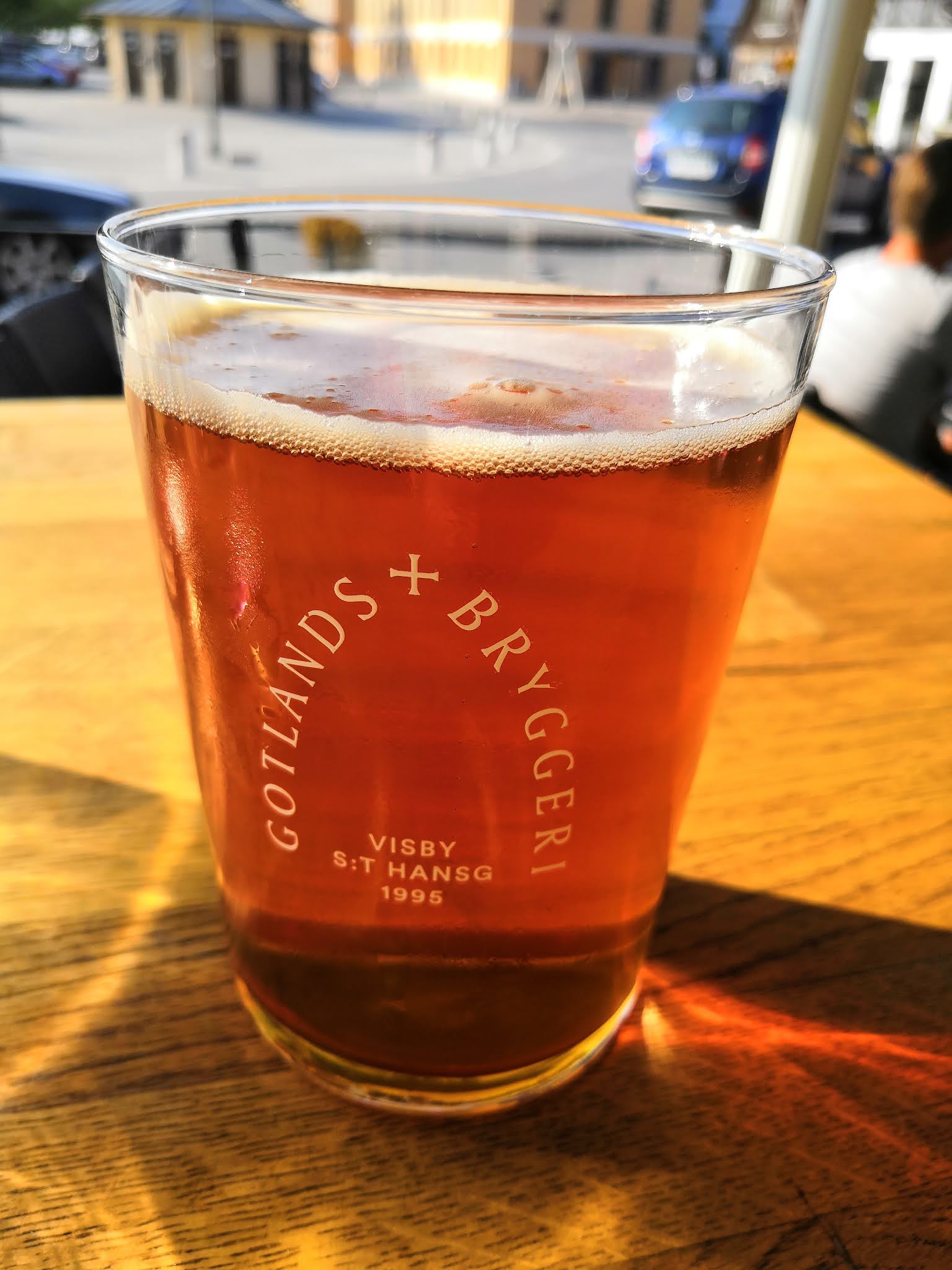 Visbyssä on runsaasti ravintolatarjontaa, mutta me teimme aika paljon ruokaa leirintäalueella, joten emme kovin monessa ravintolassa edes käyneet. Viimeisenä päivänä kun olimme vieneet rinkkamme laivaterminaaliin säilöön, pysähdyimme syömään sataman edessä olevaan ravintolaan Joda bari & kökiin. Täällä maistoimme Wisby lageria, joka oli hyvää. Vieressä istuva ruotsalaismies kysyi mitä olutta juodaan ja haki itsellensä samanlaisen ihasteltuaan meidän oluita, näytti niin hyvältä, oli hyvän värinen kuulemma. Ja kyllähän se hyvältä maistui lämpimänä kesäpäivänä, Visbyssä oli parhaimmillaan +27 astetta lämmintä heinäkuussa.