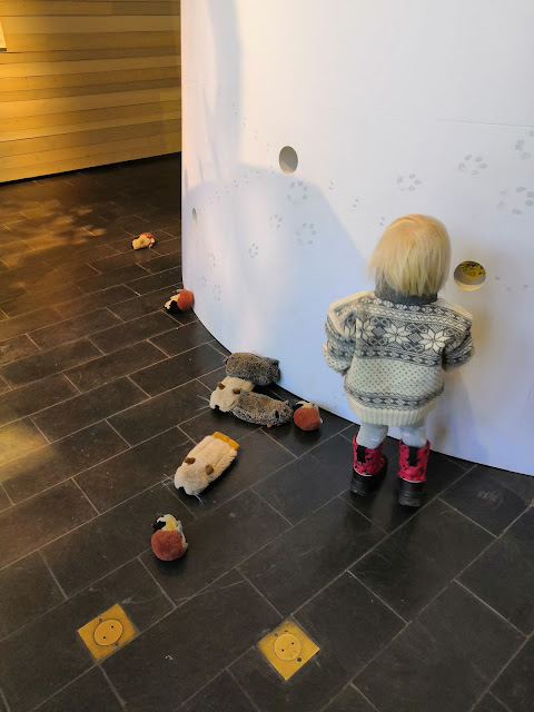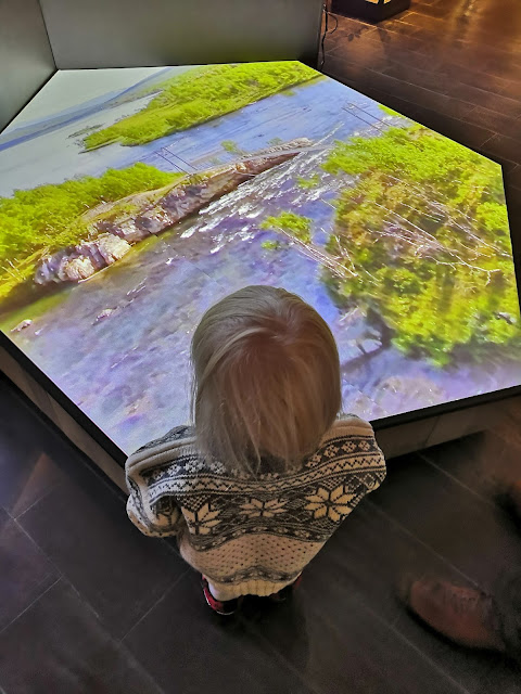 Aamu valkeni aurinkoisena ja harmitti, ettei meillä ollut aikaa jäädä tänne pidemmäksi aikaa. Ennenkuin jatkoimme matkaa kohti Suomea, pistäydyimme vielä Abiskon luontokeskuksessa. Luontokeskuksen pihapiiriin voi jättää auton lähtiessä vaellusreiteille. Samassa pihapiirissä on myös Abiskon turistiasema. Luontokeskuksessa esitellään luonnollisesti alueen luontoa, siellä oli lapsillekin pieni maja sisällä. Yläkerrassa oli valokuvanäyttely ja Abiskon pienoismalli.