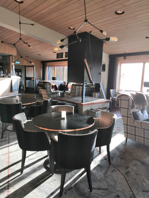 Se oli oikea ratkaisu loman päätteeksi, kuinka ihanaa olikin romahtaa hotellihuoneen sänkyyn monen teltassa nukutun yön jälkeen. Itse hotellihuone oli tosi perus, hotellin yleistilat oli viihtyisät ja kivat tunturihenkisyydellään. Aulabaarin kokolattiamatto oli kuvaltaan paikan maastokartta, takka toi tunnelmaa ja luonnollisesti myös porontaljat alueen pohjoista henkeä. Aulan vieressä on kiva lastenhuone, jonka välissä oli lasiseinä viemässä mahdolliset melut pois ja samalla näki koko ajan mitä lapsi touhuaa.